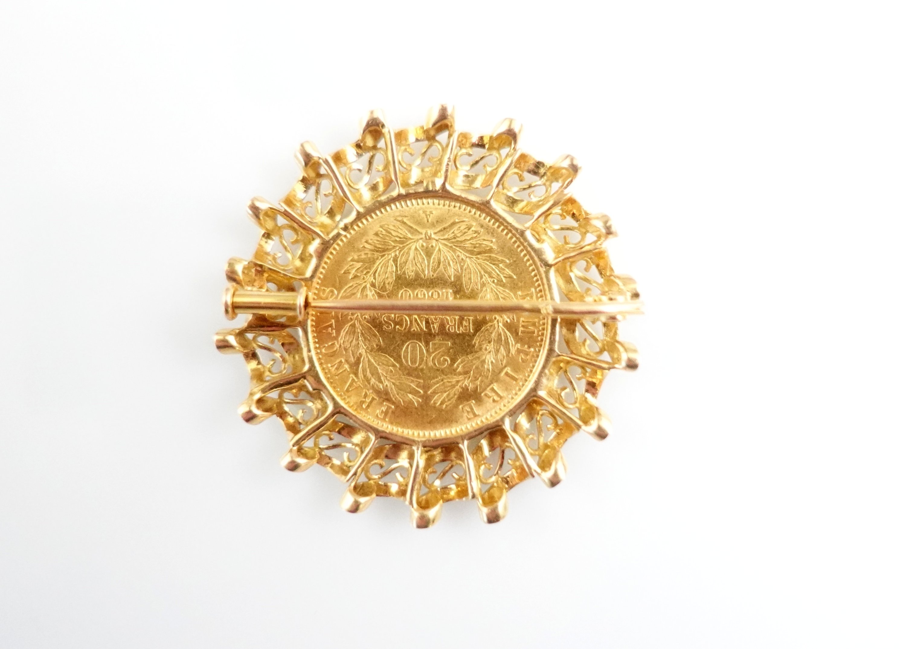 en or jaune 750 millièmes sertie d'une pièce de 20 francs or "Napoléon tête nue" de 1860.