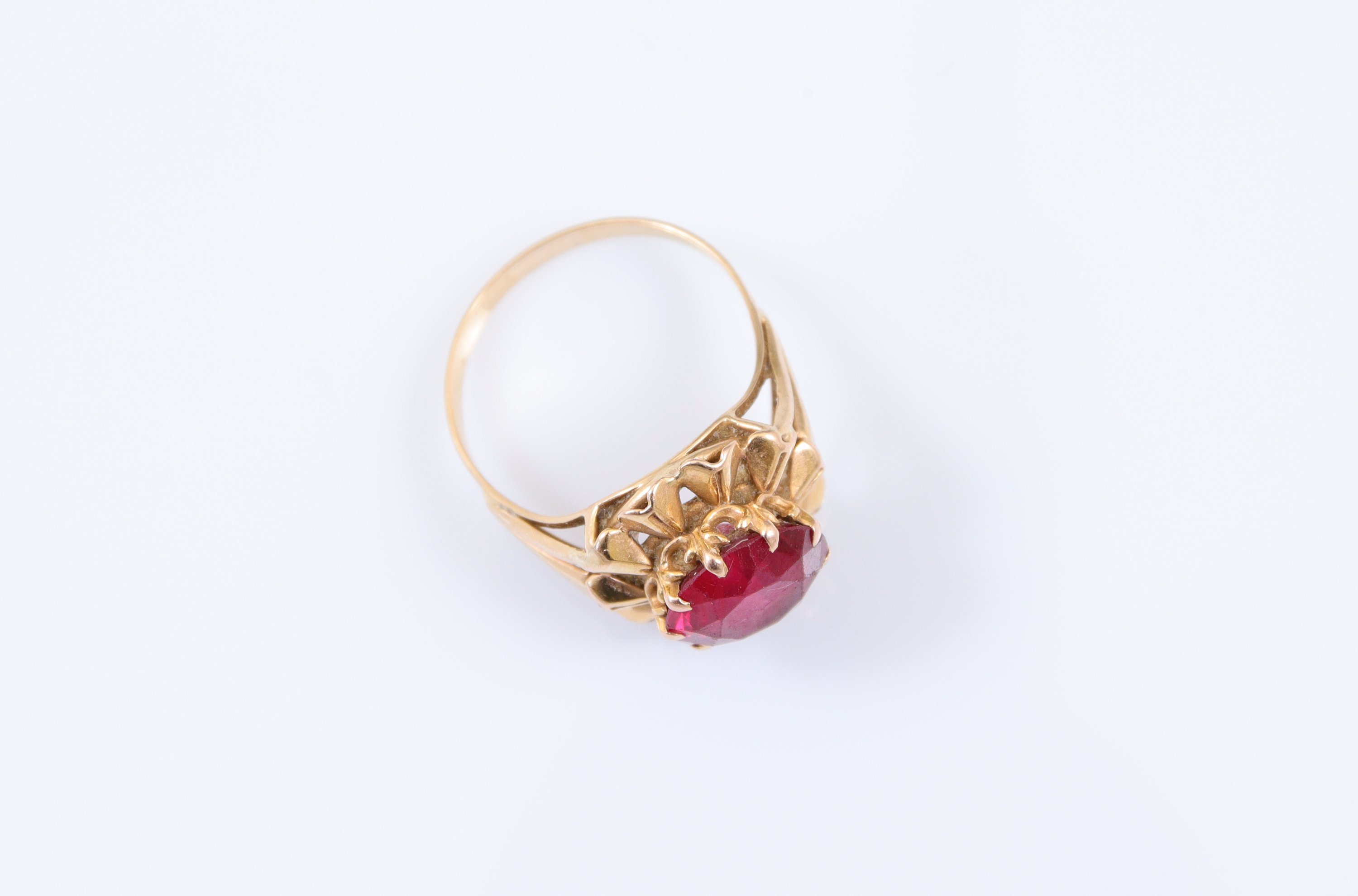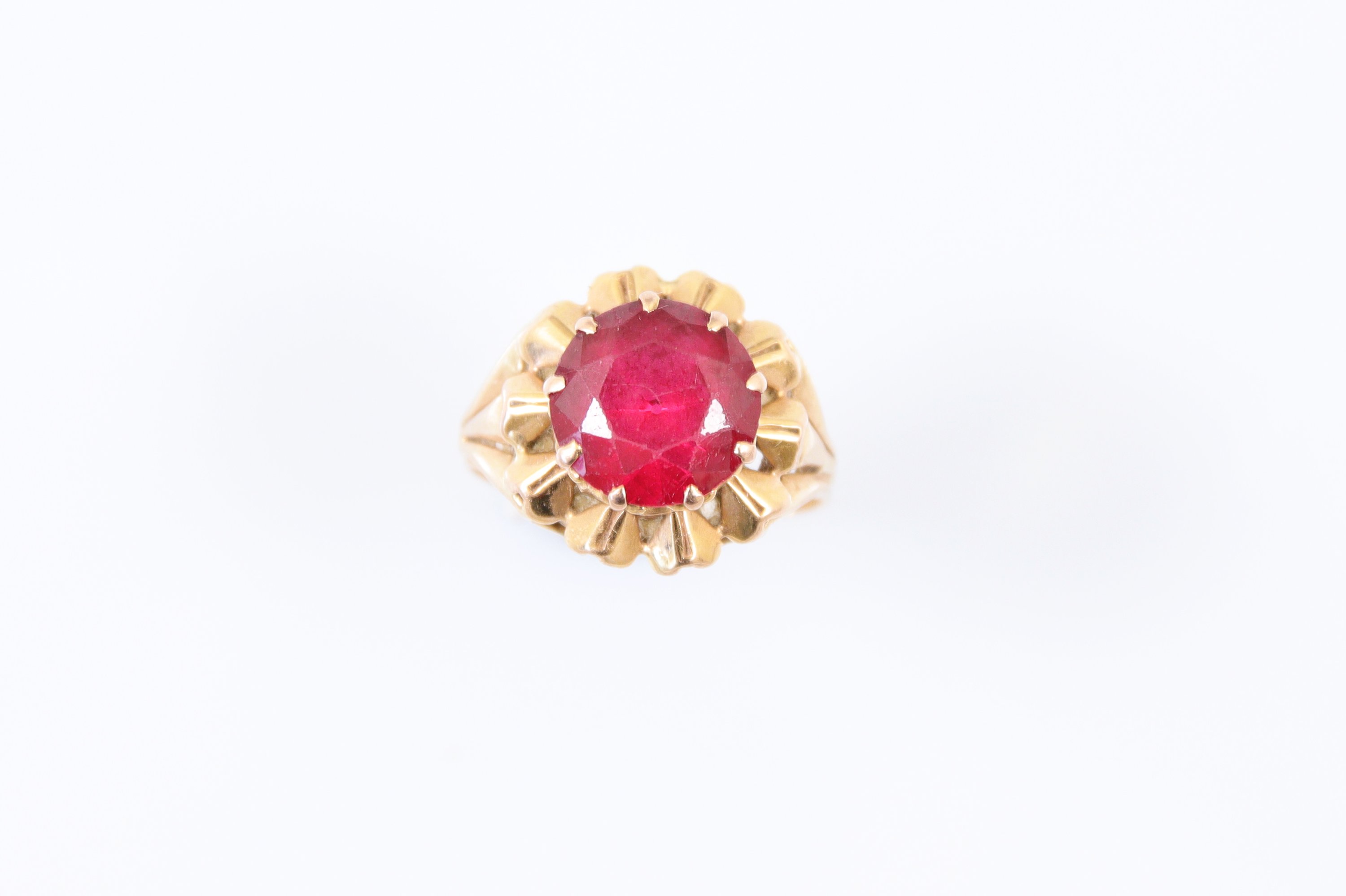 en or jaune 750 millièmes, le centre orné d'une pierre d'imitation rouge de forme ronde.