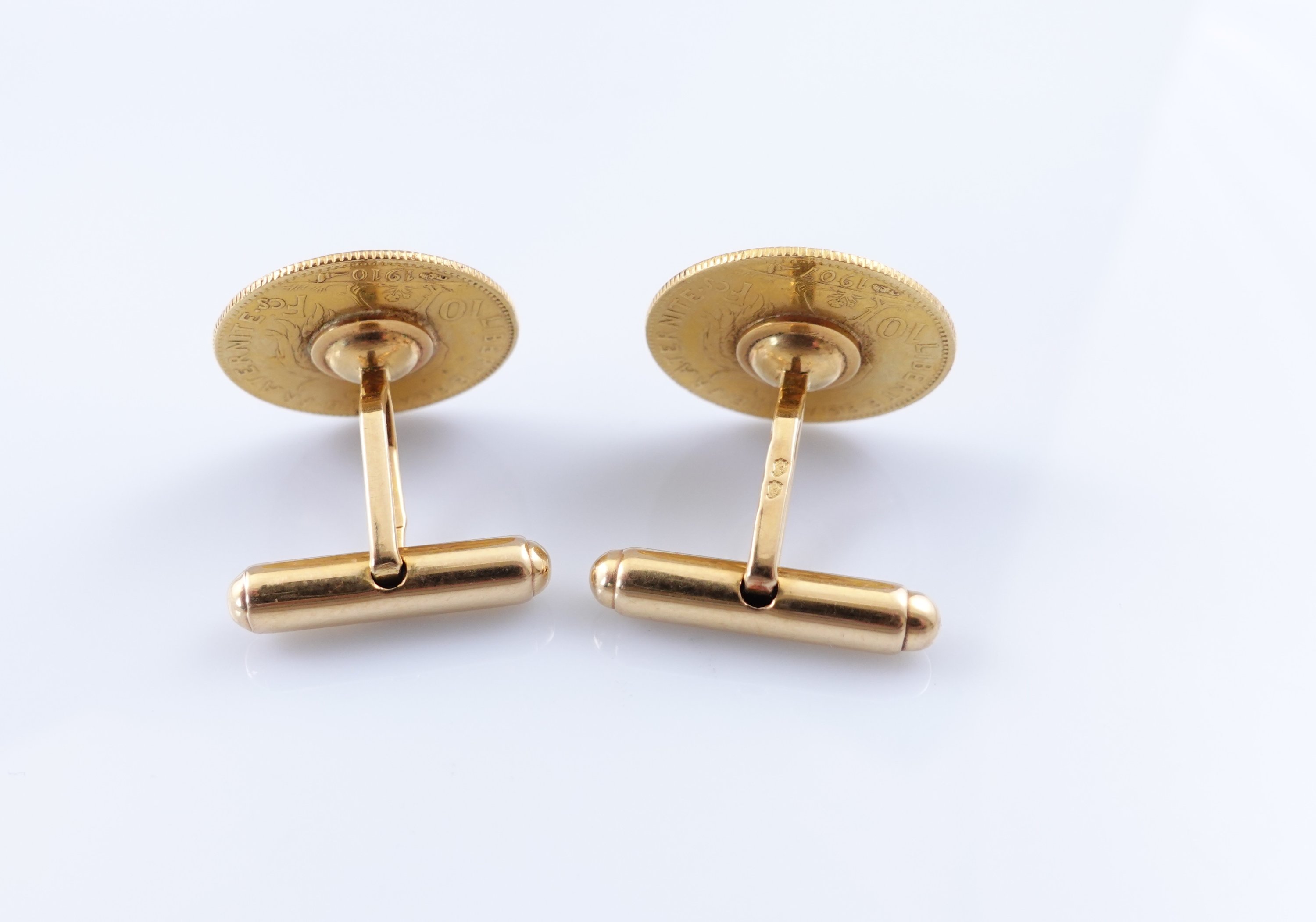 en or jaune 750 millièmes, sertis de deux pièces de 10 francs or au coq 1907 et 1910.