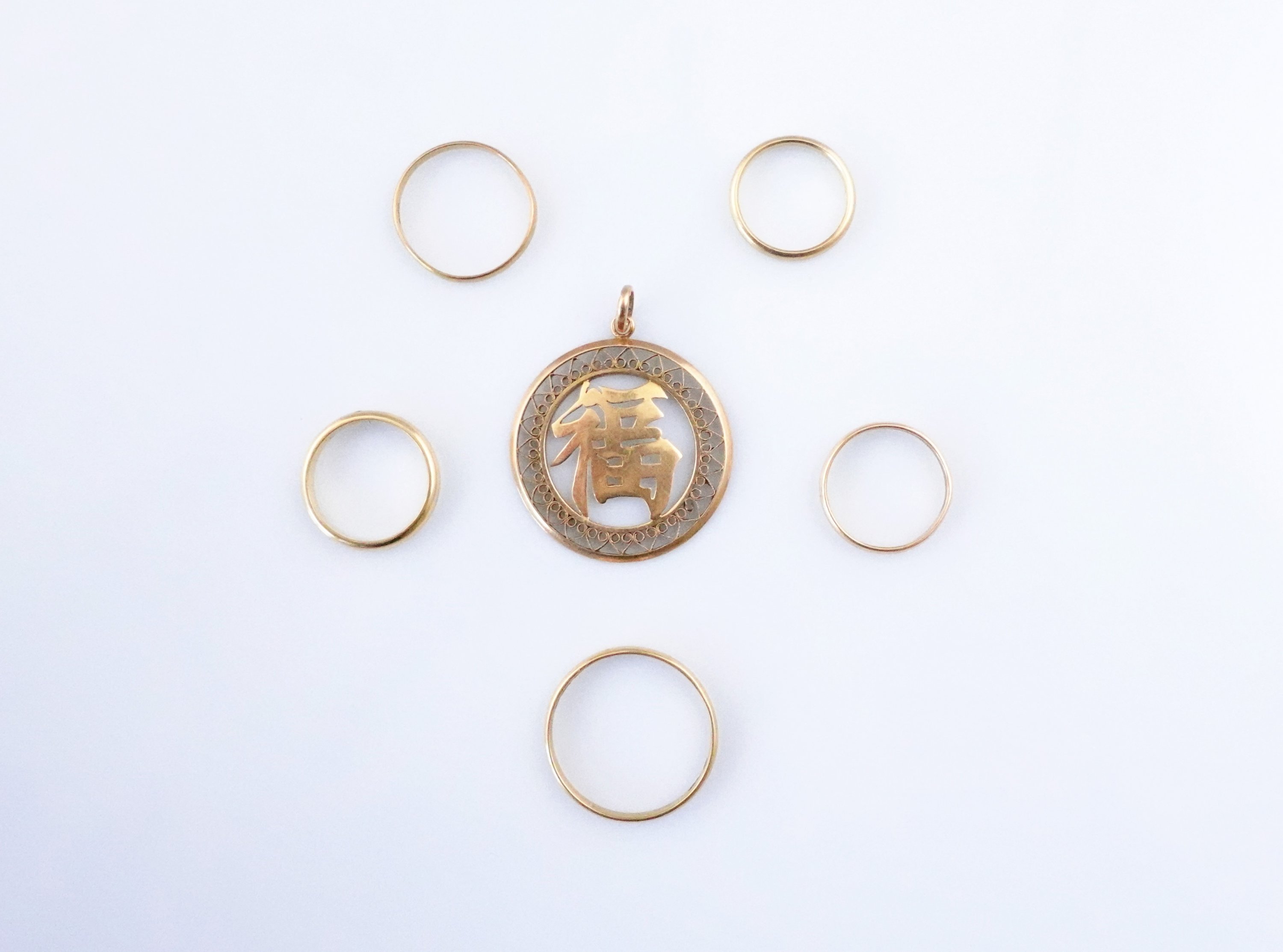 en or jaune 750 millièmes. Le pendentif circulaire à décor d'un caractère asiatique.