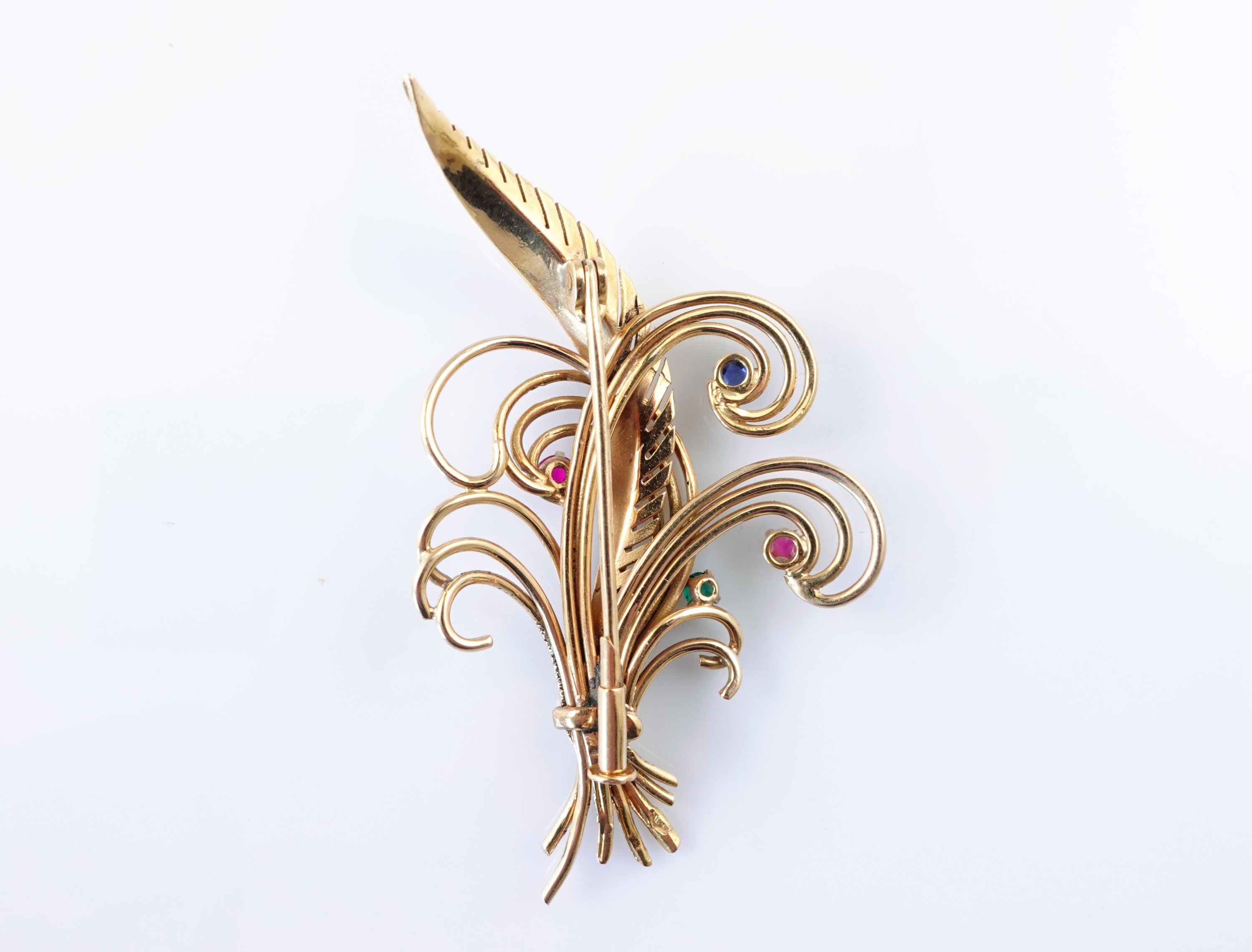 en or jaune 750 millièmes sertie de deux rubis, un saphir et une émeraude.