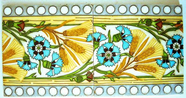 SARREGUEMINES, CREIL-MONTEREAU, GIEN. 5 carreaux. Élément de frise à décor de fleurs, 201 x 201 mm. Cloisonné à décor de fleurs en rosace, 208 x 208 mm. Deux carreaux à décor d'une frise en cloisonné, oeillet et blé, 201 x 201 mm, même décor au restaurant La Cigale à Nantes. Croix rose et bouquets de fleurs blanches, marque GIEN. 204 x 204 mm.