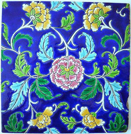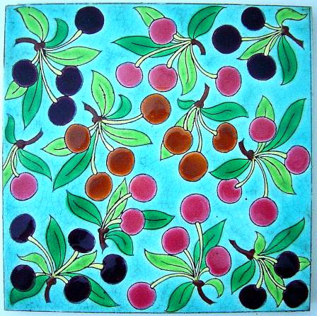 GIEN et LONGWY. 2 carreaux. Pivoine rouge et feuillages sur fond bleu, marque GIEN, 195 x 200 mm ; Jeté de cerises sur fond turquoise, marque LONGWY, 200 x 200 mm.