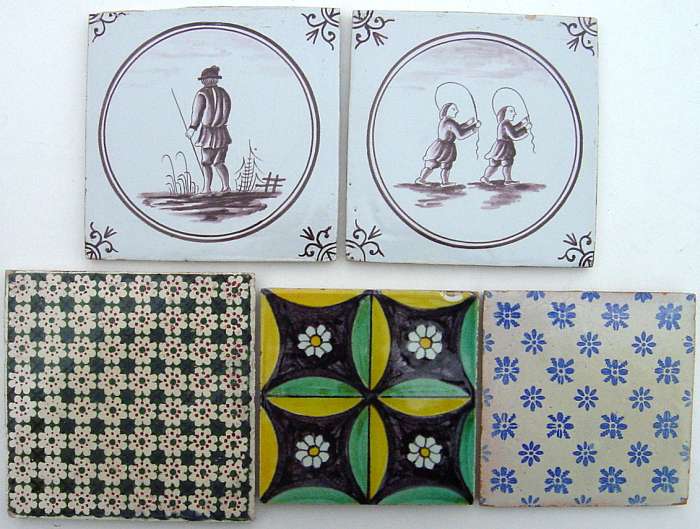 MANUFACTURES DIVERSES. Lot de 32 carreaux, divers motifs, 110 x 110 mm. Joint 4 carreaux cobalt à décor de fleurs stylisées, montés en dessous de plat, 230 x 230 mm.