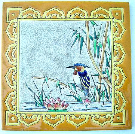 BORDEAUX. 2 carreaux. Cartel en feuille de vigne orné d'un oiseau sur une branche, 195 x 200 mm ; Martin pêcheur, bambous, lotus en fleurs. Jules Vieillard, marque JV & Cie BORDEAUX, 203 x 204 mm.