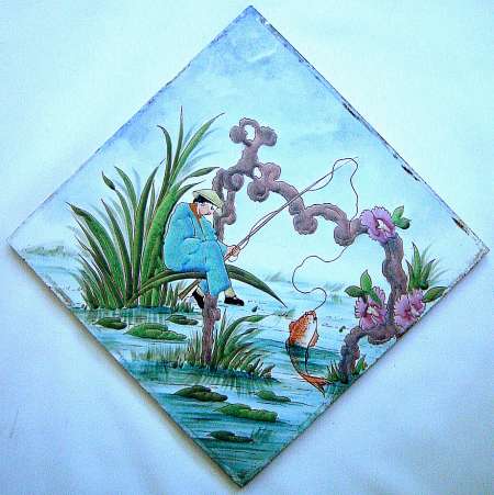 CREIL-MONTEREAU. 3 carreaux. Scène Extrême-Orient: femme au bord d'un étang, arbre à fleurs, nénuphars et libellule, polychrome, marque MONTEREAU B & Cie CREIL, 253 x 253 mm ; Jeune homme pêchant, marque MONTEREAU B & C CREIL, 252 x 252 mm ; Fleur bleue stylisée sur fond ocre, marque MONTEREAU B & C CREIL, 199 x 200 mm.