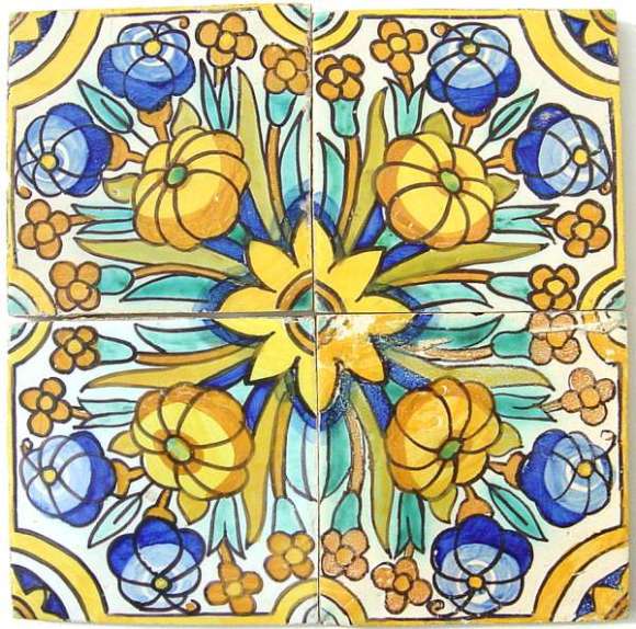 DESVRES. 4 carreaux manganèse à décor de personnages et habitations, fabrique Fourmaintraux-Courquin, 110 x 110 mm ; Suite de 4 carreaux polychrome à décor de fleurs, fabrique Fourmaintraux-Courquin, 130 x 130 mm.