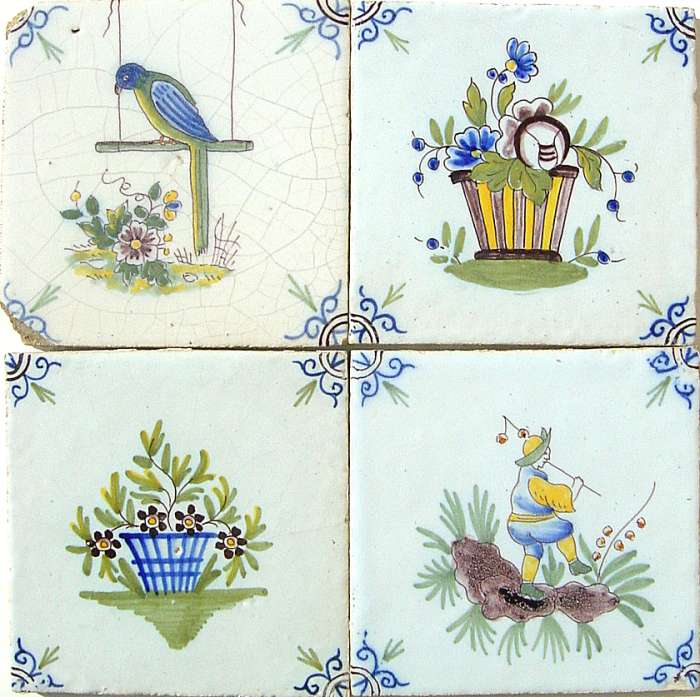DESVRES. 11 carreaux. Suite de 4 carreaux polychromes à décor d'oiseau, personnage et bouquets de fleurs, fabrique Fourmaintraux au petit coq, 130 x 130 mm ; 2 carreaux à décor d'un oiseau et vase avec bouquet de fleurs, 130 x 130 mm. Joint 5 carreaux bleu uni, 100 x 100 mm.