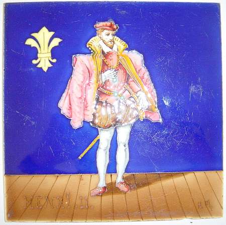 LONGWY et DIVERS. 2 carreaux. Femme en robe blanche cueillant des fleurs roses, marque LONGWY FRANCE, 207 x 208 mm ; Carreau représentant Henri II et fleurs de lys jaune sur fond bleu, 202 x 202 mm.