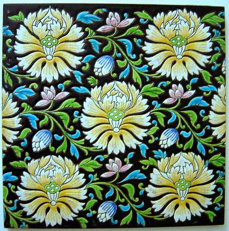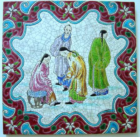 GIEN. 2 carreaux. Groupe de chinois dans un cartel entouré de rouge, marque GIEN,. 197 x 198 mm, maison décorée en façade à St Omer ; Cinq fleurs jaunes sur fond noir, marque GIEN, 198 x 198 mm.