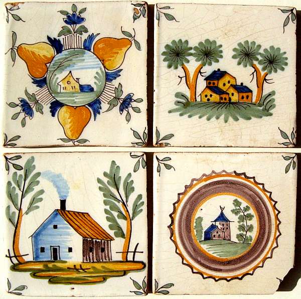 FORGES LES EAUX. 8 carreaux. Maisons, arbres et fruits, polychrome ; Personnages et maisons ; Carreau orné d'un arbre, XIXème. 100 x 100 mm.