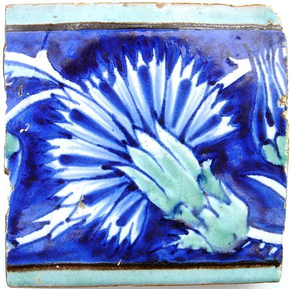 NEVERS. 7 carreaux. 3 carreaux polychromes à décor géométrique, marque D. Nevers, XIXème. 120 x 120 cm ; Carreau polychrome à décor d'une vache, XIXème, 100 x 100 mm ; 2 carreaux polychromes à décor géométrique, marques A.L. Nevers et L.E. Nevers., 100 x 100 mm ; Carreau bleu-vert à décor d'un chardon, marque en creux aux D entrelacés, 130 x 130 mm.