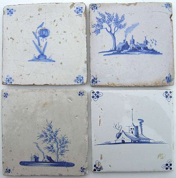 HOLLANDE. DELFT. 8 carreaux, 130 x 130 mm. 4 carreaux manganèse et cobalt à décor de bouquets de fleurs et poisson, XVIIIème et XIXème ; 4 carreaux cobalt à décor de paysage et d'un lilium, époques différentes dont XVIIIème.