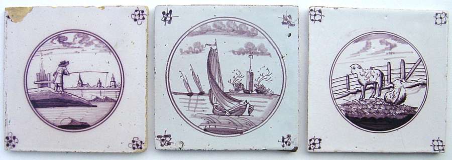 HOLLANDE. DELFT. 2 carreaux manganèse à décor de bateaux et pêcheur, XIXème, 130 x 130 mm. Joint carreau manganèse à décor de moutons. SAINT-OMER? 130 x 130 mm.