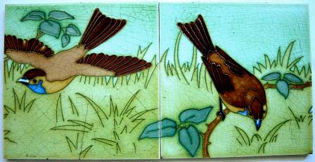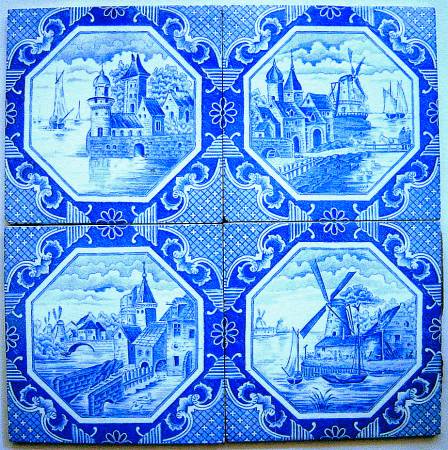 BELGIQUE et SAINT AMAND & HAMAGE. 7 carreaux. Paysages de villes et moulins, marque H, 152 x 152 mm ; 2 carreaux, partie de frise à décor d'oiseaux ; Moulin à vent, habitations et bateau, marque SAINT AMAND NORD ET HAMAGE, 202 x 202 mm.