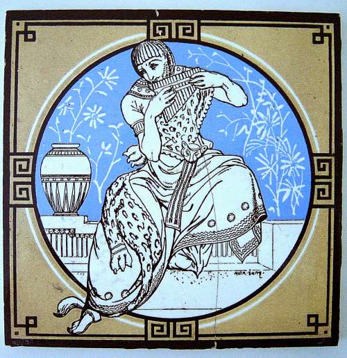 ANGLETERRE et MINTONS. 2 carreaux. Scène de cueillette de fleurs, marque JOSIAH WEDGWOOD & SONS ETRURIA, 206 x 206 mm ; Joueur de flûte de pan, signé Moyr Smith, marque MINTON'S CHINA WORKS STOKE ON TRENT, 205 x 205 mm.
