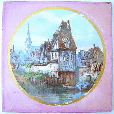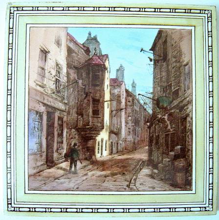 MINTONS et CREIL-MONTEREAU. 2 carreaux. Rue de ville, marque "Stoke upon Trent, Mintons, Wallsroole London, MINTON'S, China Works, Stoke on Trent, K", vers 1880, 204 x 204 mm ; Paysage urbain dans un cercle or, marque MONTEREAU L.M. & Cie CREIL, 202 x 202 mm.