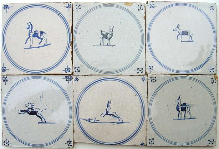 ANGLETERRE. LIVERPOOL. Delft anglais. 6 carreaux cobalt à décor d'animaux, XIXème, 130 x 130 mm.