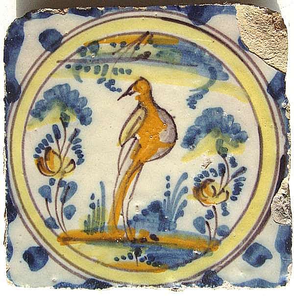 ESPAGNE, PORTUGAL et CHINE. 5 carreaux. Échassier, polychrome, XVIIIème, 134 x 134 mm ; Carreau polychrome à décor de fleurs, 141 x 141 mm ; Croix centrale, palmettes et entrelacs, polychrome, marque GRAN MEDAILLE ORO PARIS 78, 258 x 258 mm ; Animal fantastique, 124 x 125 mm ; Carreau à décor du chien Fo, polychrome, porcelaine, peint à la main, 140 x 140 mm.