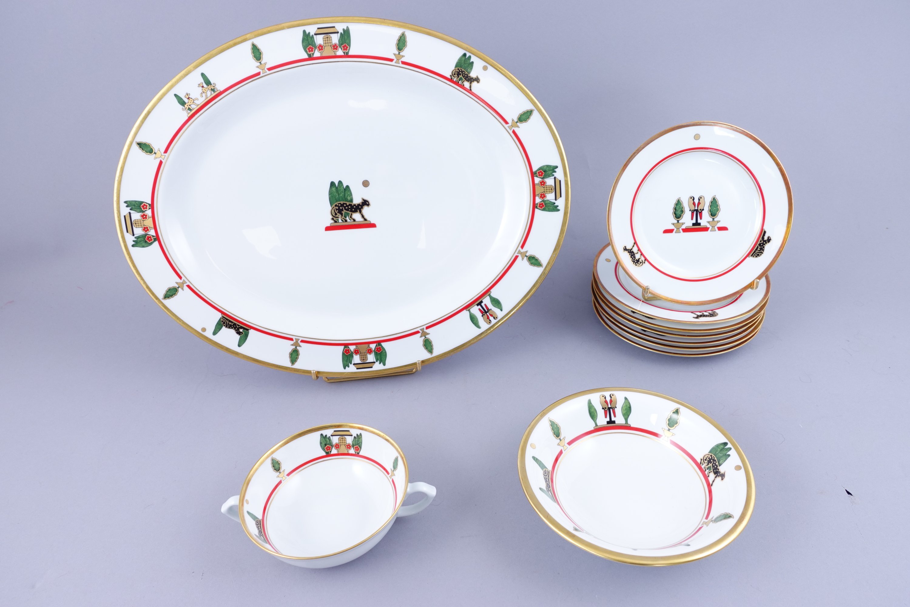 en porcelaine blanche émaillée polychrome, à décor de panthères et de perroquets entre des arbres. Il se compose d'un plat ovale, de sept assiettes, d'un bol et d'une coupe à anses.