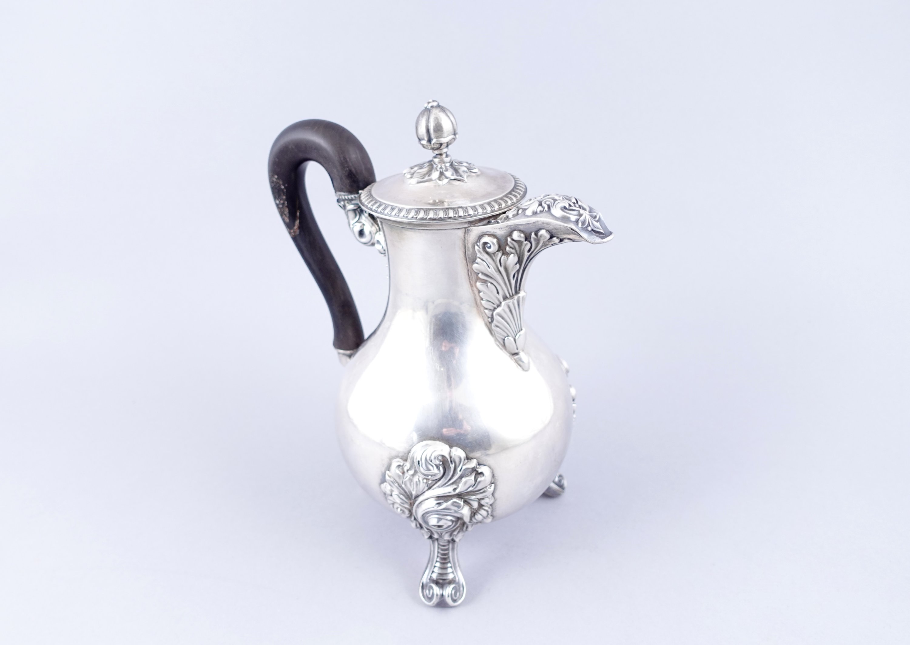 en argent, le fretel en grenade sur une terrasse de feuilles, le bec à décor de feuilles d'acanthe. Piétement tripode à enroulements. Anse en bois noirci.
