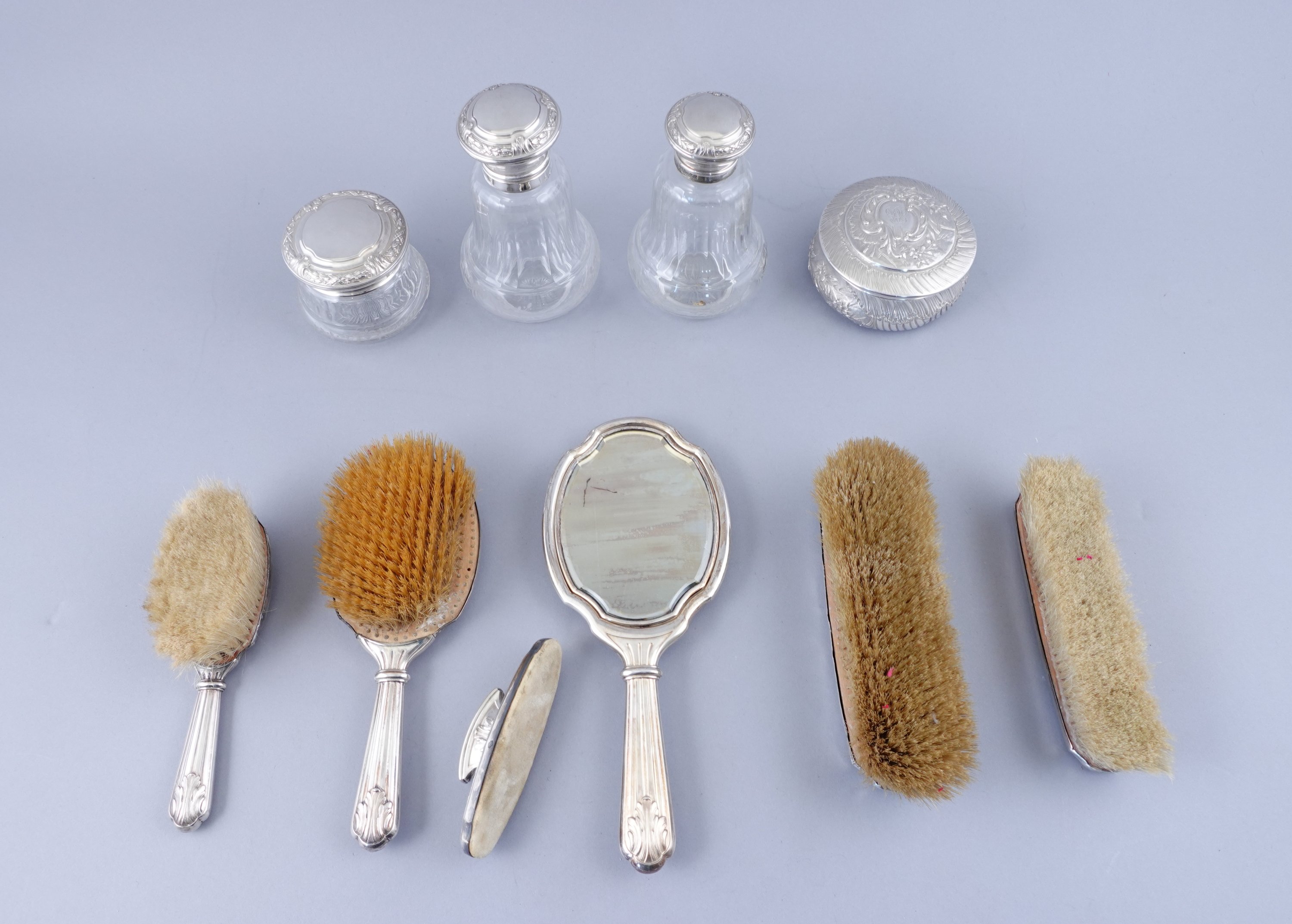en argent à décor de tores de laurier comprenant: quatre brosses, un miroir, deux flacons, un poudrier et un tampon à ongles.