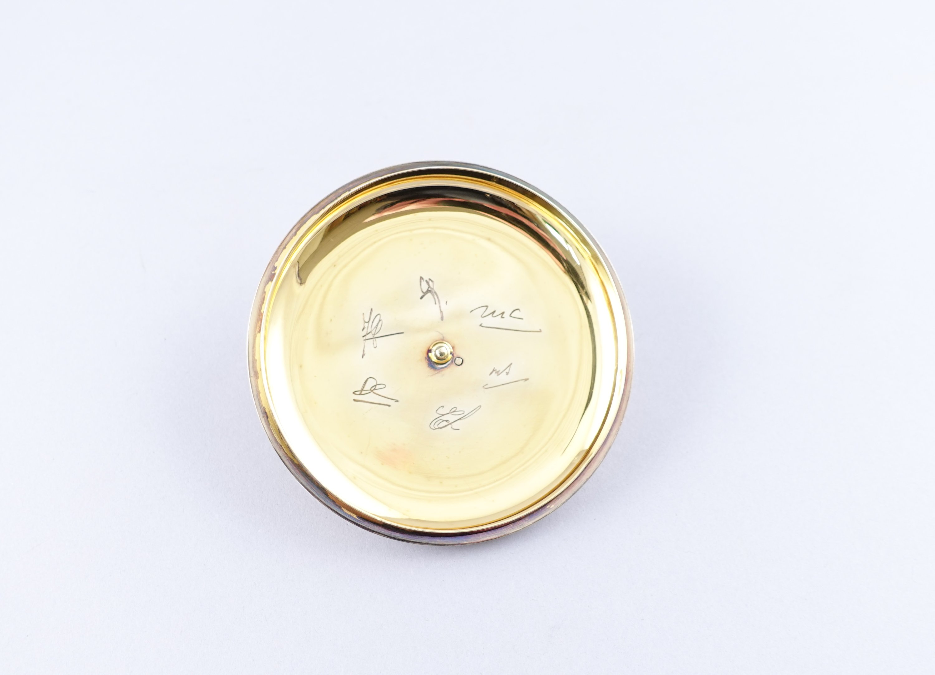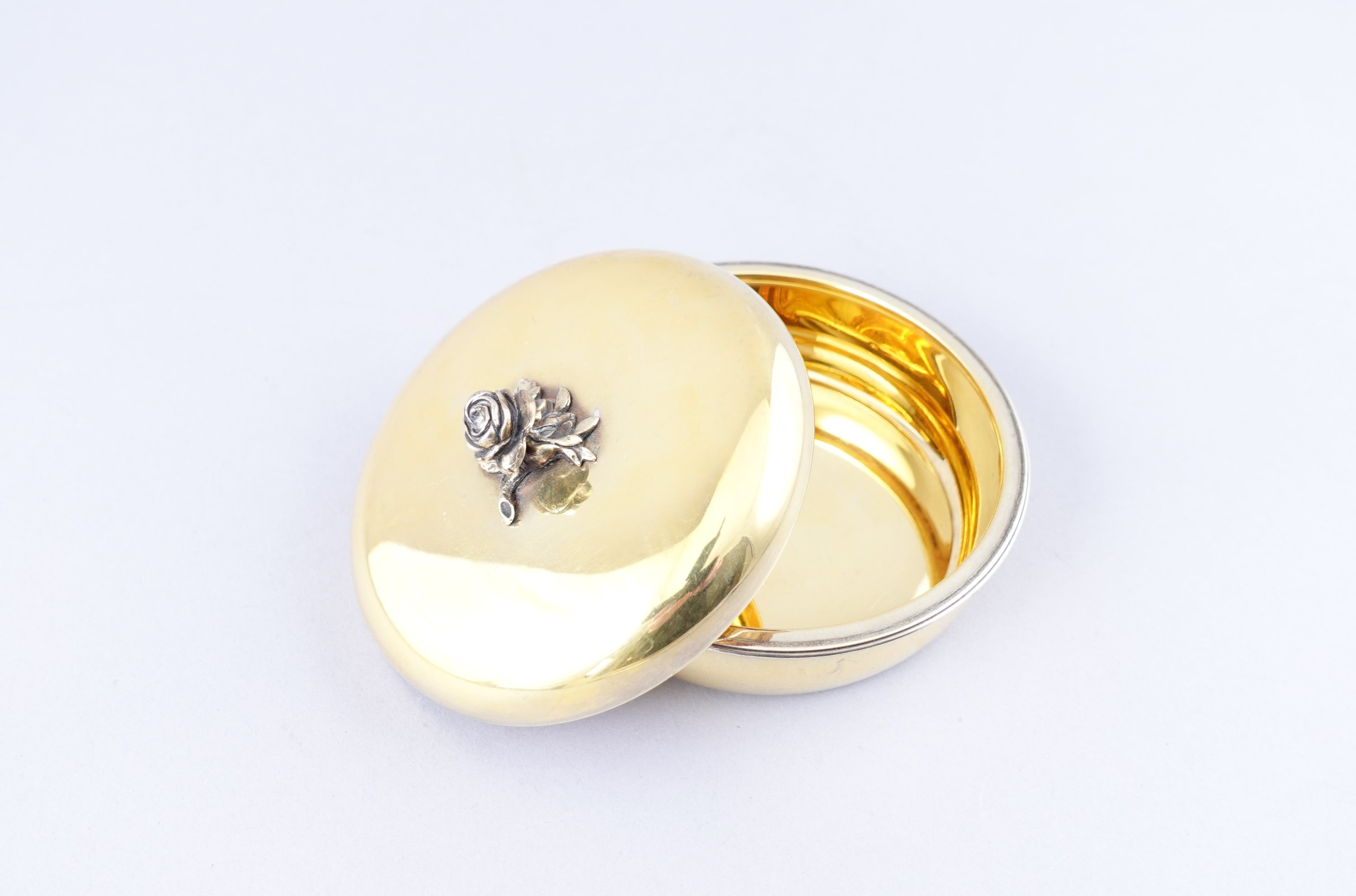 en vermeil, de forme circulaire, au couvercle sommé d'un fretel en forme de rose sur une terrasse végétale.