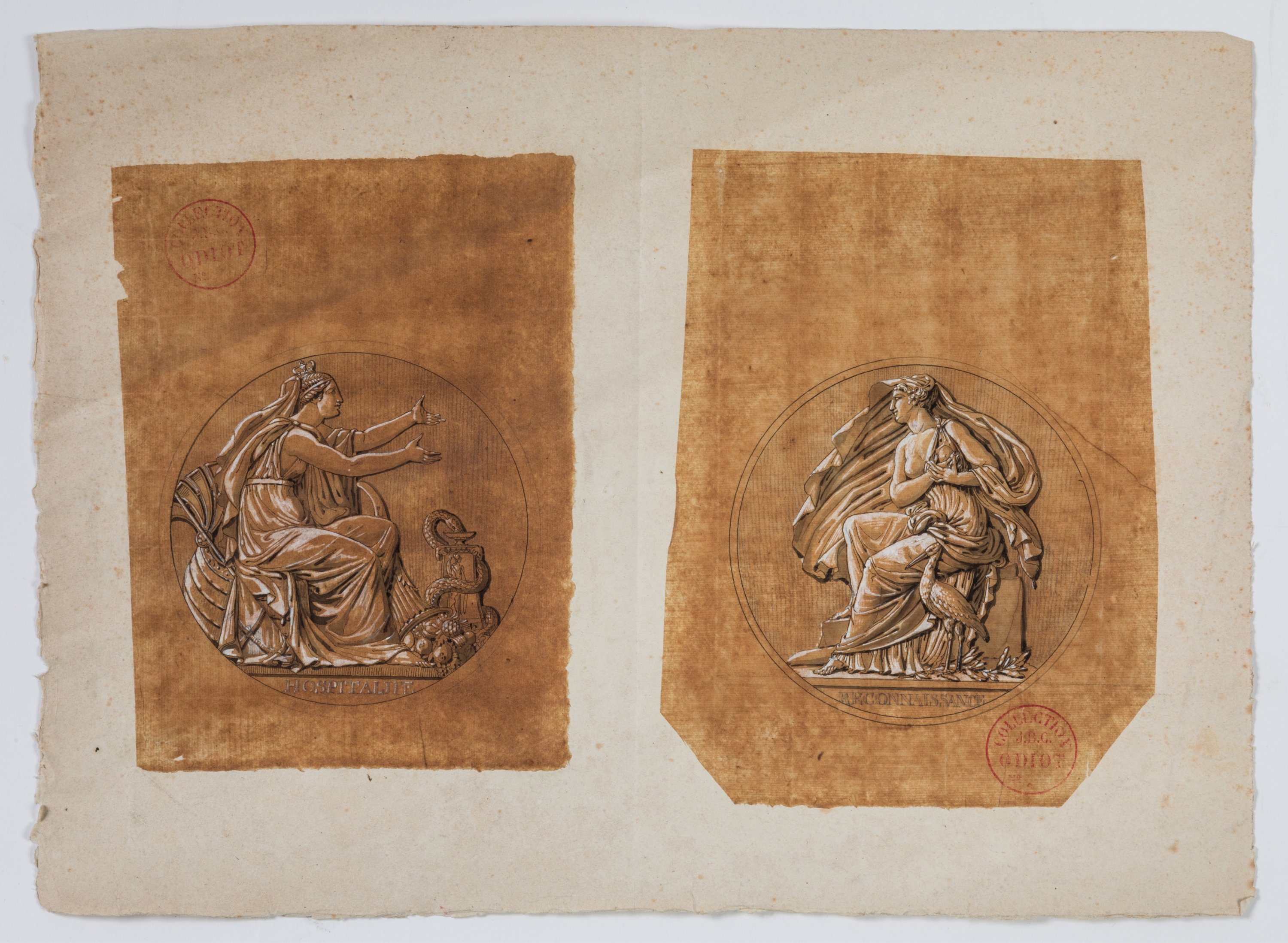 Mine de plomb, encre et rehaut de blanc sur papier. Titrés. Inscription "Prudhon", au crayon, au dos de la feuille de montage.