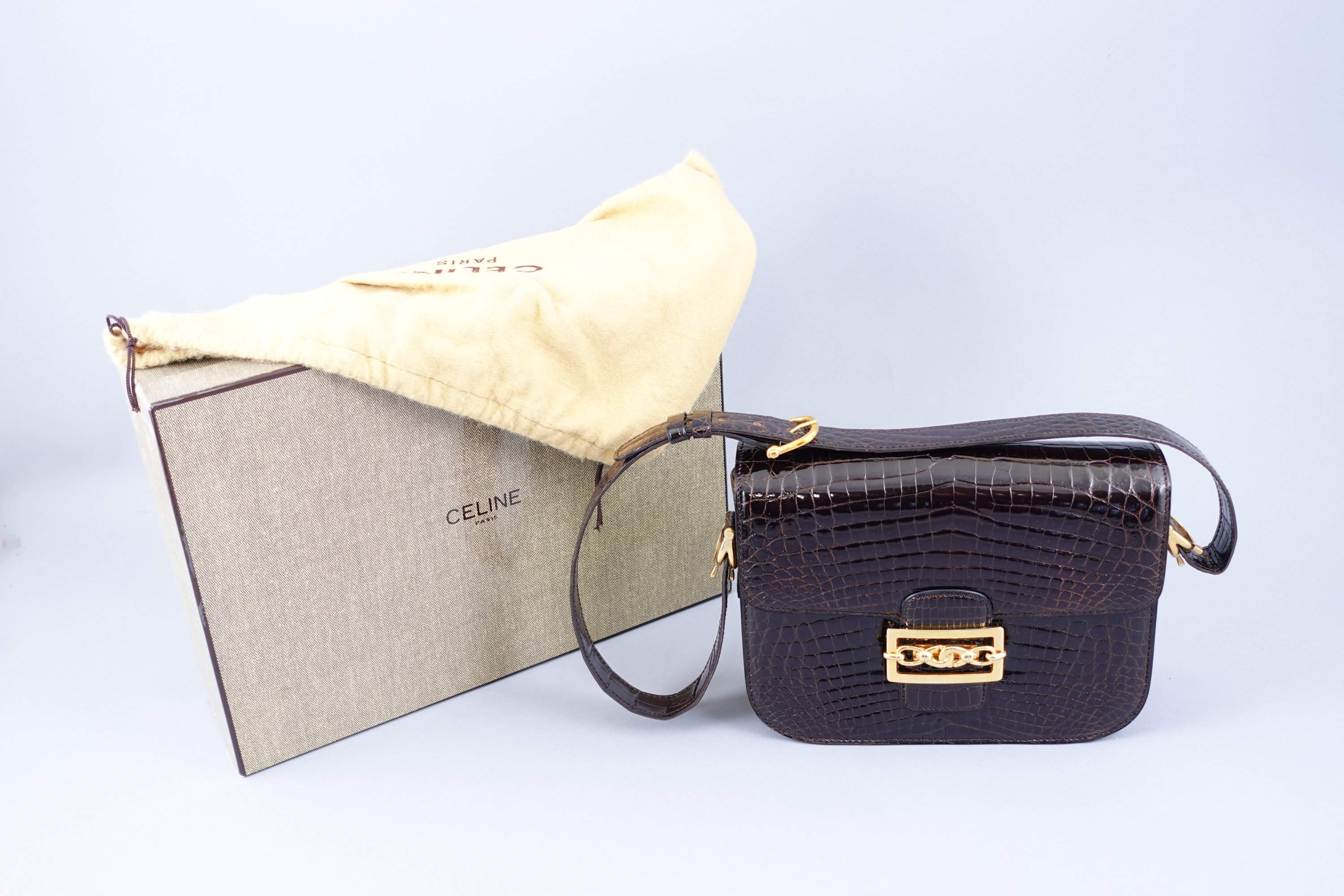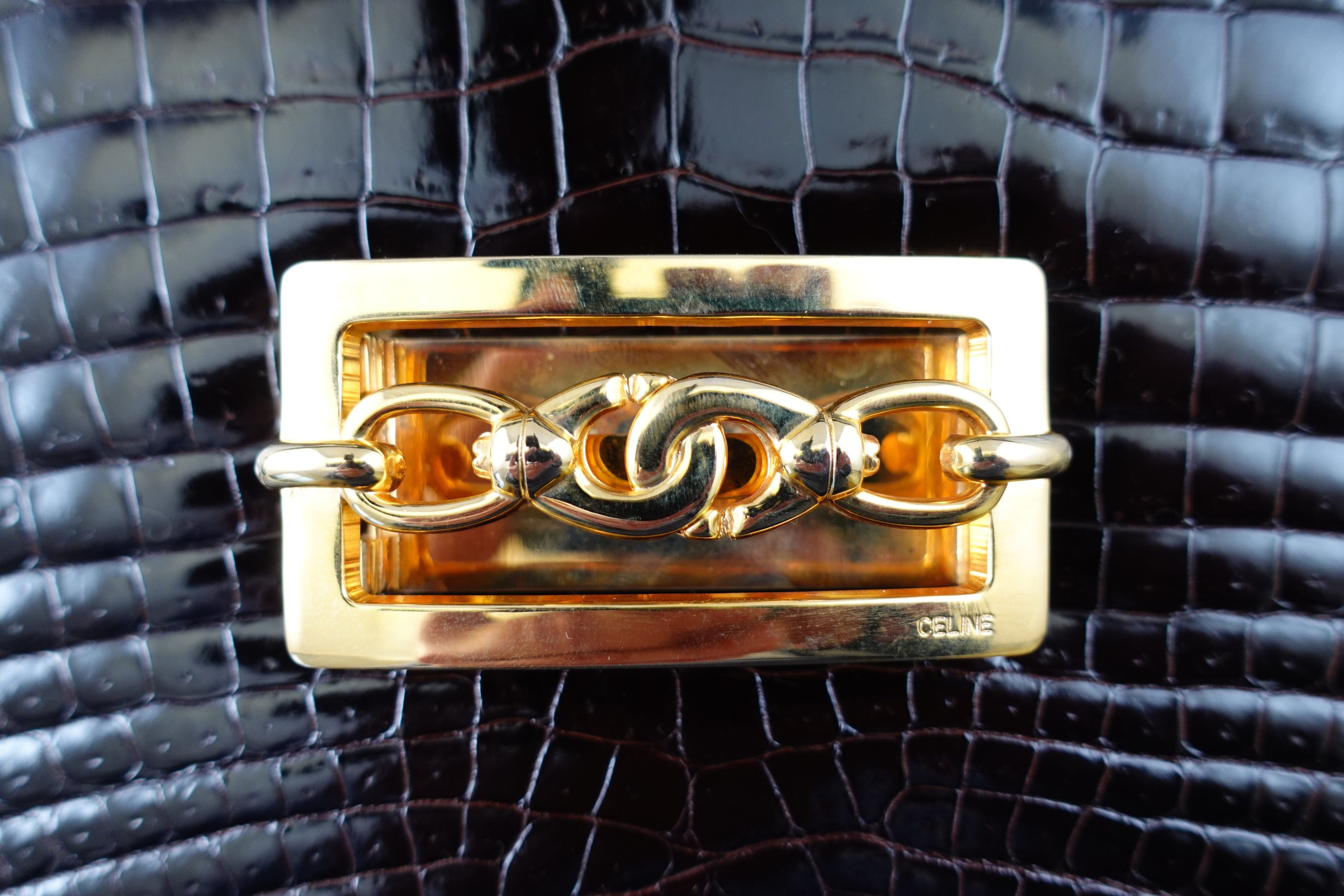 en crocodile brun à 3 soufflets. Fermeture dorée. Bandoulière réglable.
