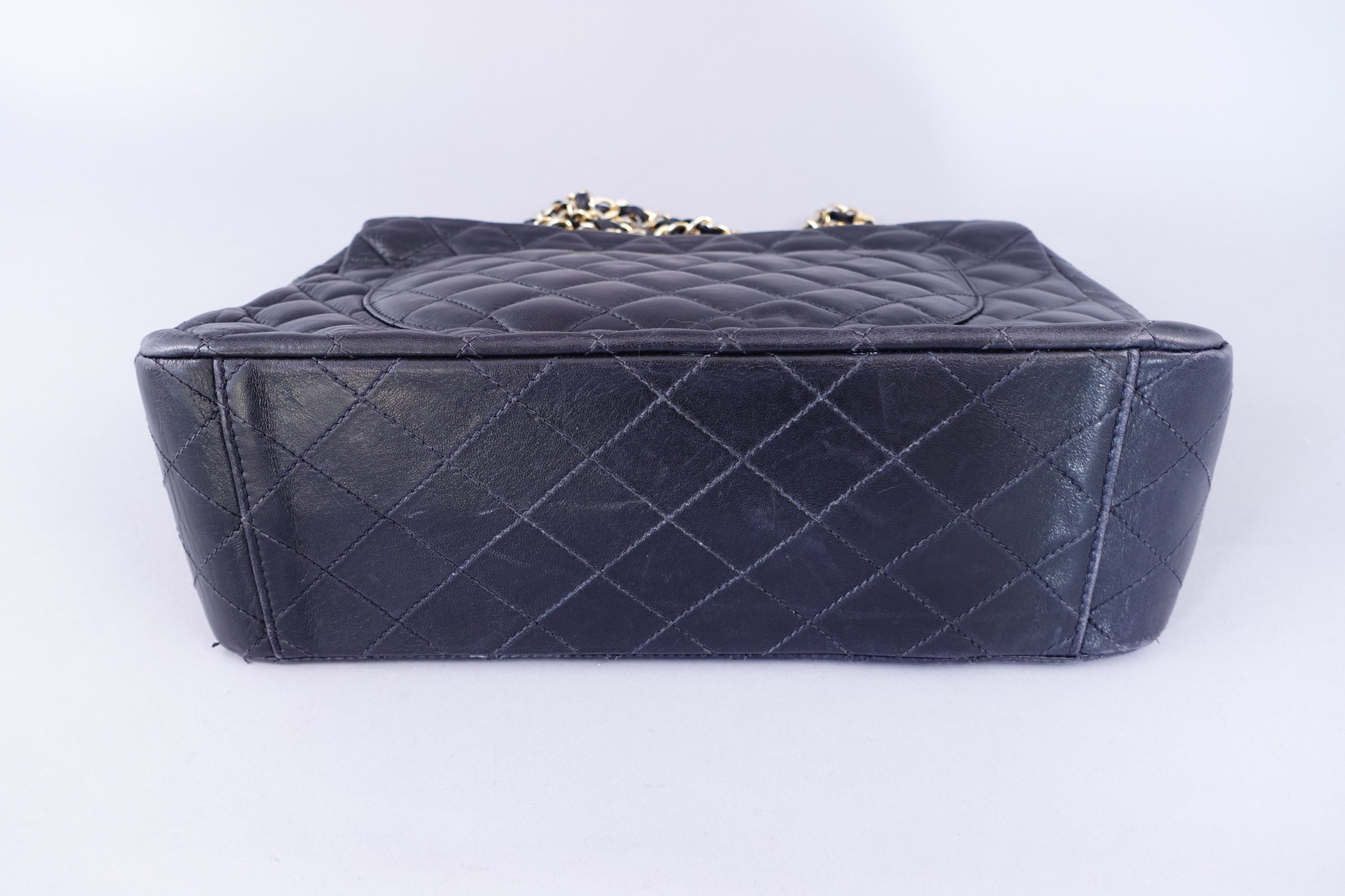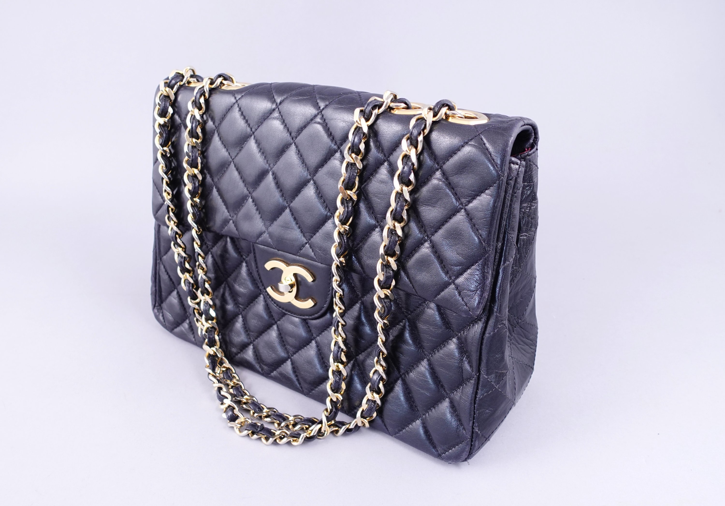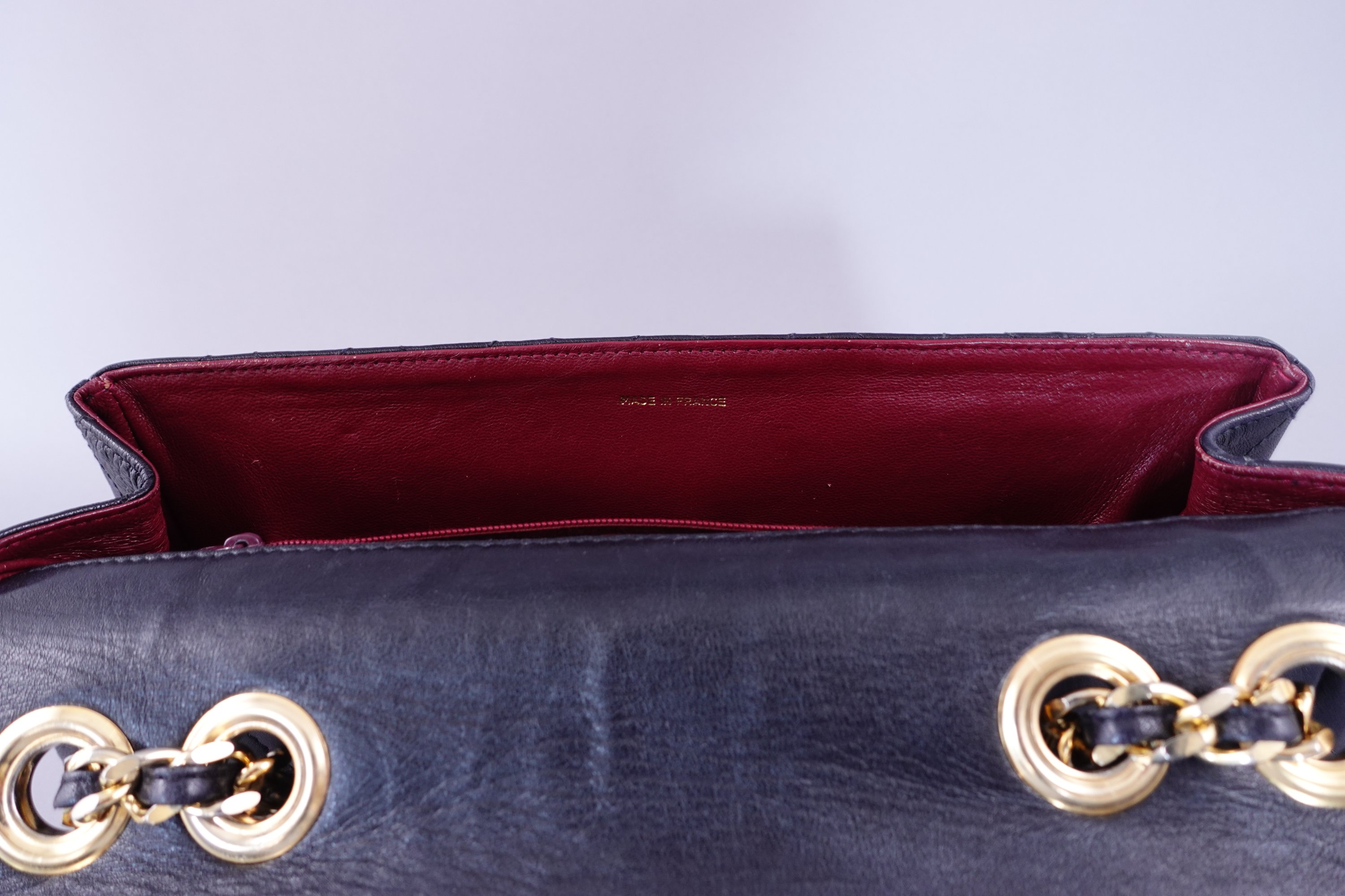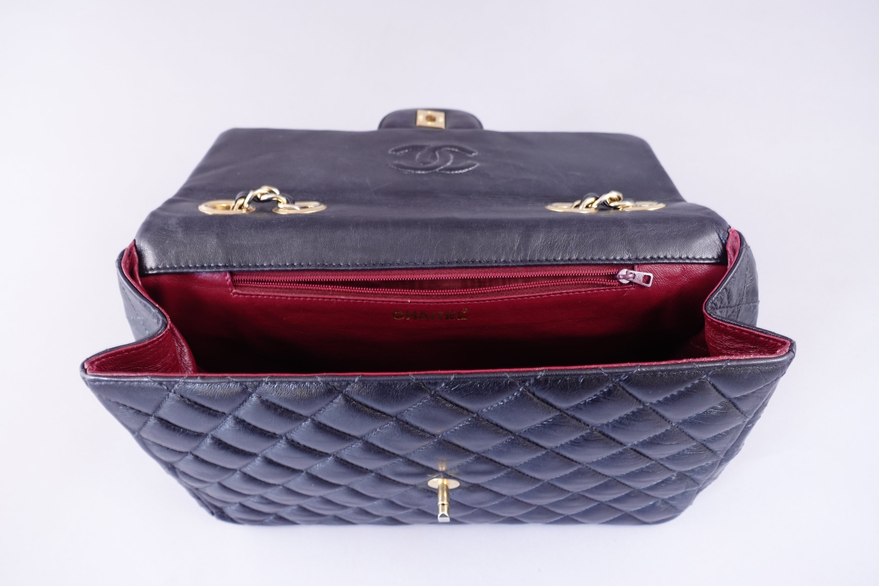 en cuir d'agneau noir matelassé. Doublure en cuir bordeaux. Double C doré sur le rabat. Poche extérieure.