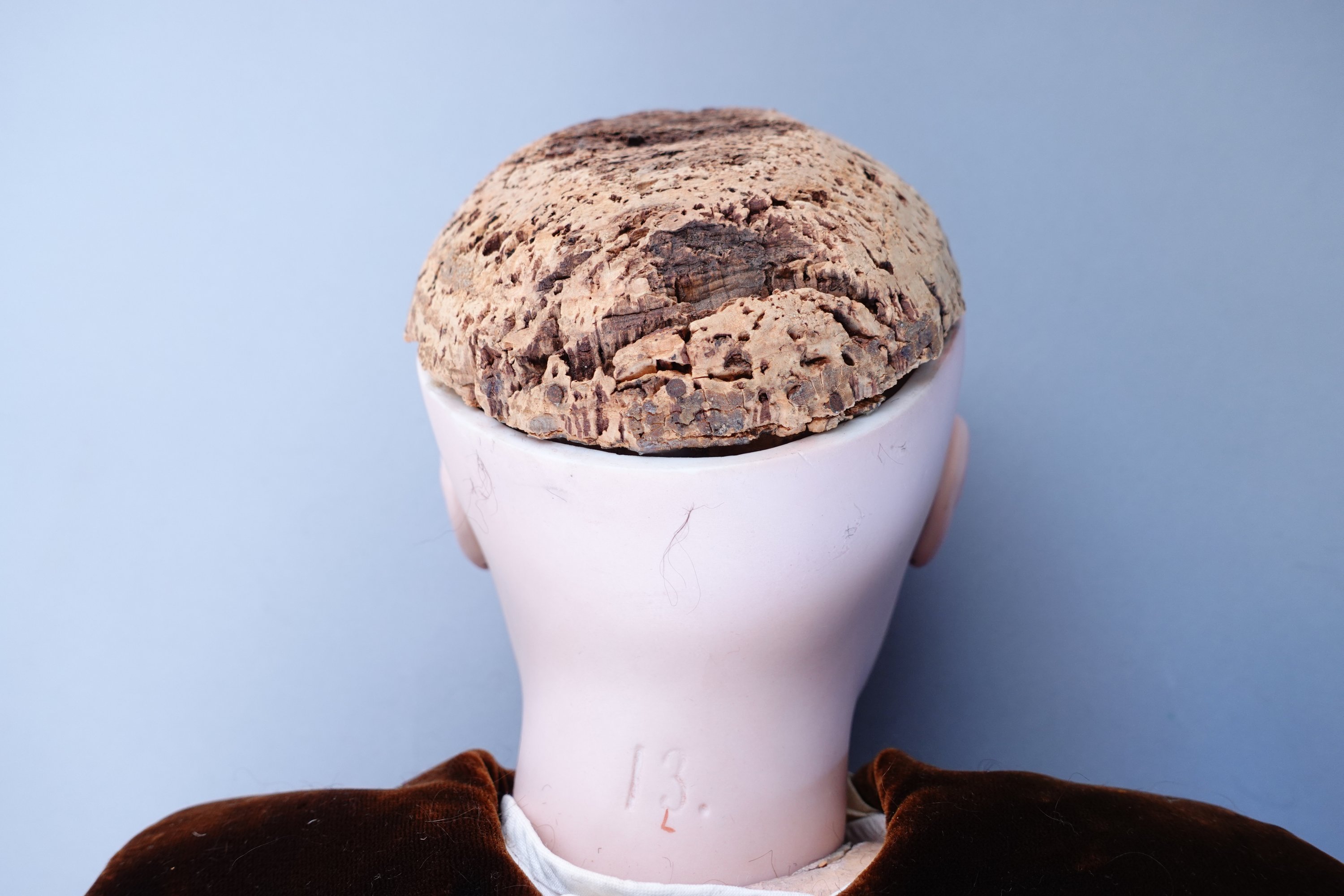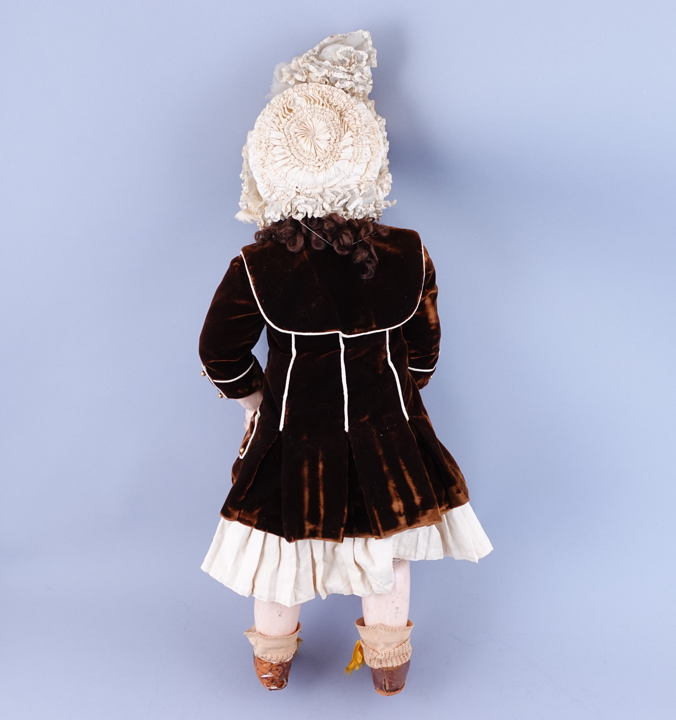 Tête en biscuit pressé. Taille 13, marquée "13". Oreilles rapportées et percées, yeux de sulfure bleus. Beau corps tout articulé à poignets fixes. Habits de style et perruque.