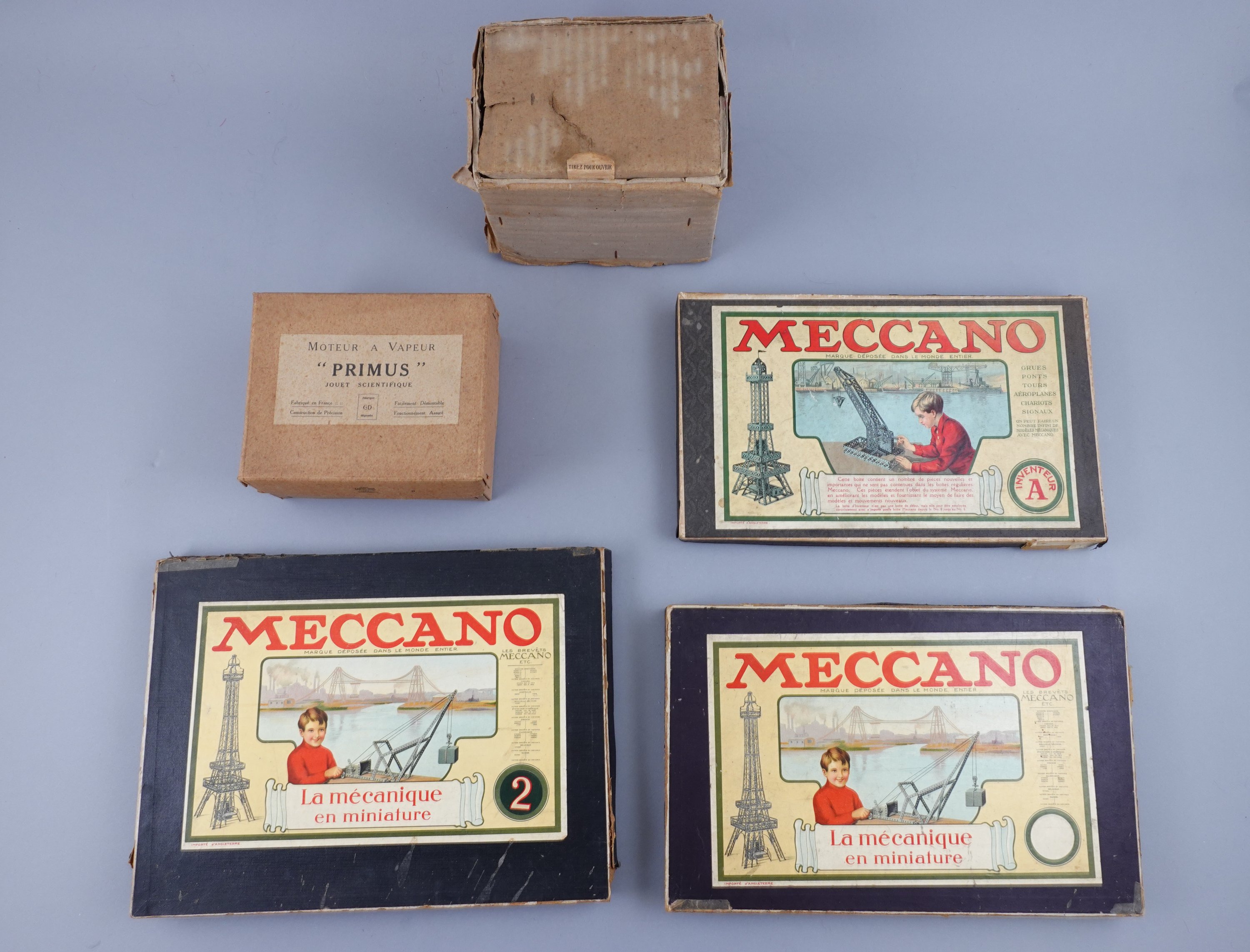 - Meccano. Trois boîtes de pièces à monter dont une boîte "inventeur", une n° 2 et une non numérotée, assorties d'un ancien catalogue de vente et d'un manuel d'instructions. Long. 34,5 et 33,5 Haut. 26 et 24 cm pour les boîtes.