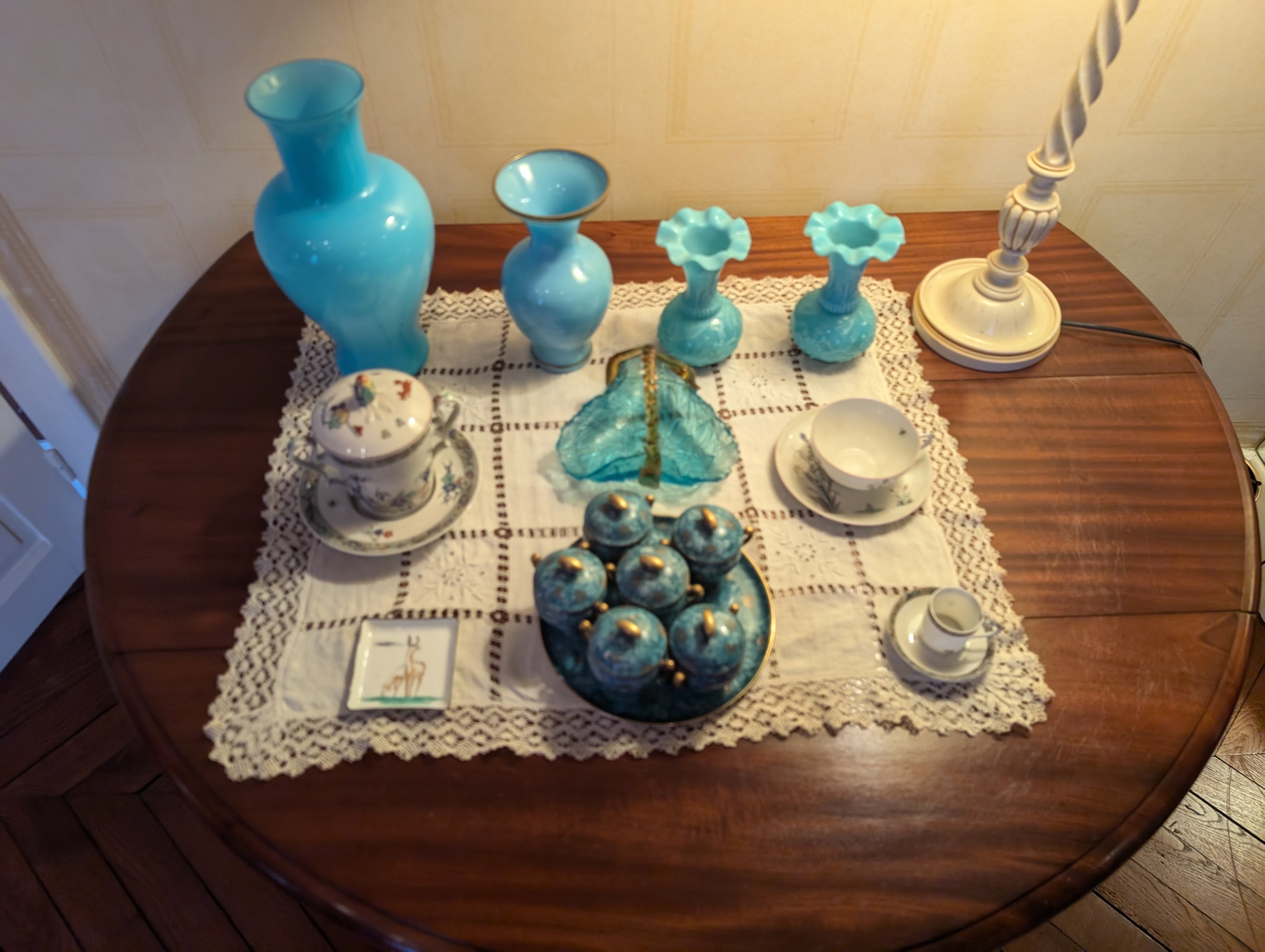 comprenant vases en opaline, tasses et leurs soucoupes, six pots à crème et leur plateau, lampe à fût torsadé.