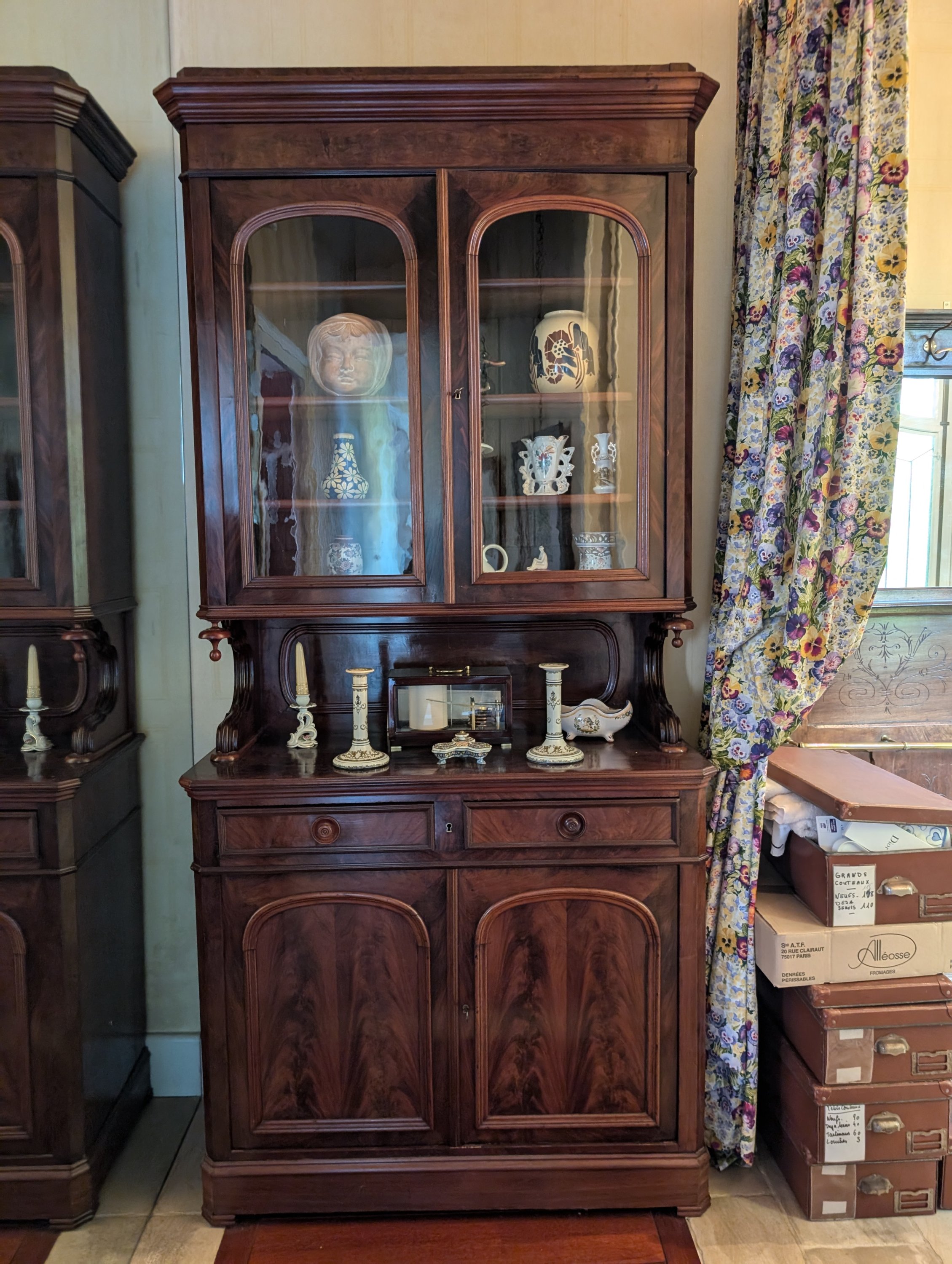 en acajou et placage d'acajou flammé. La partie supérieure à corniche surmontant deux portes vitrées, la partie inférieure ouvrant par deux tiroirs et deux vantaux.