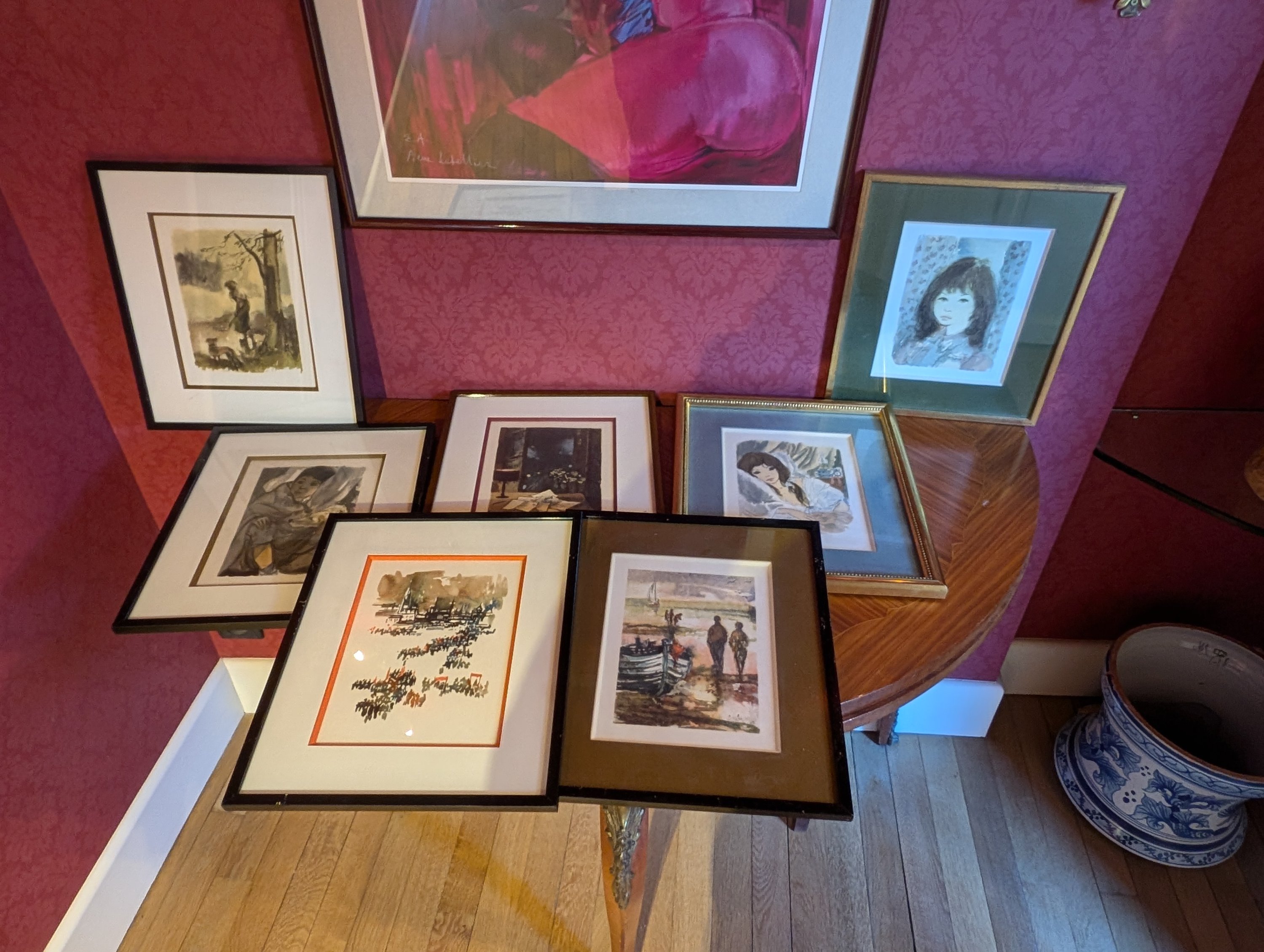 Huit pièces encadrées : pêcheurs, nu féminin, portrait.