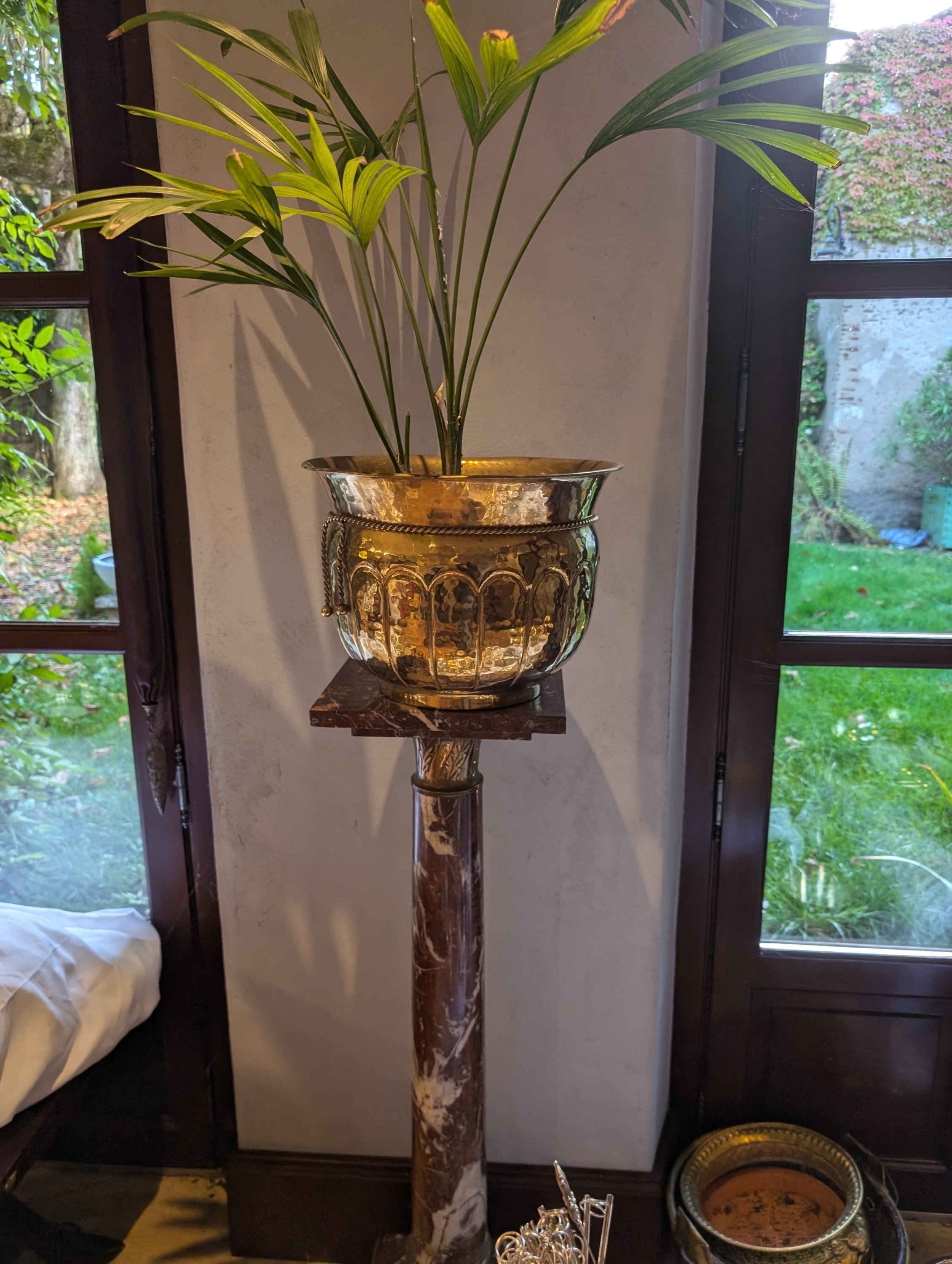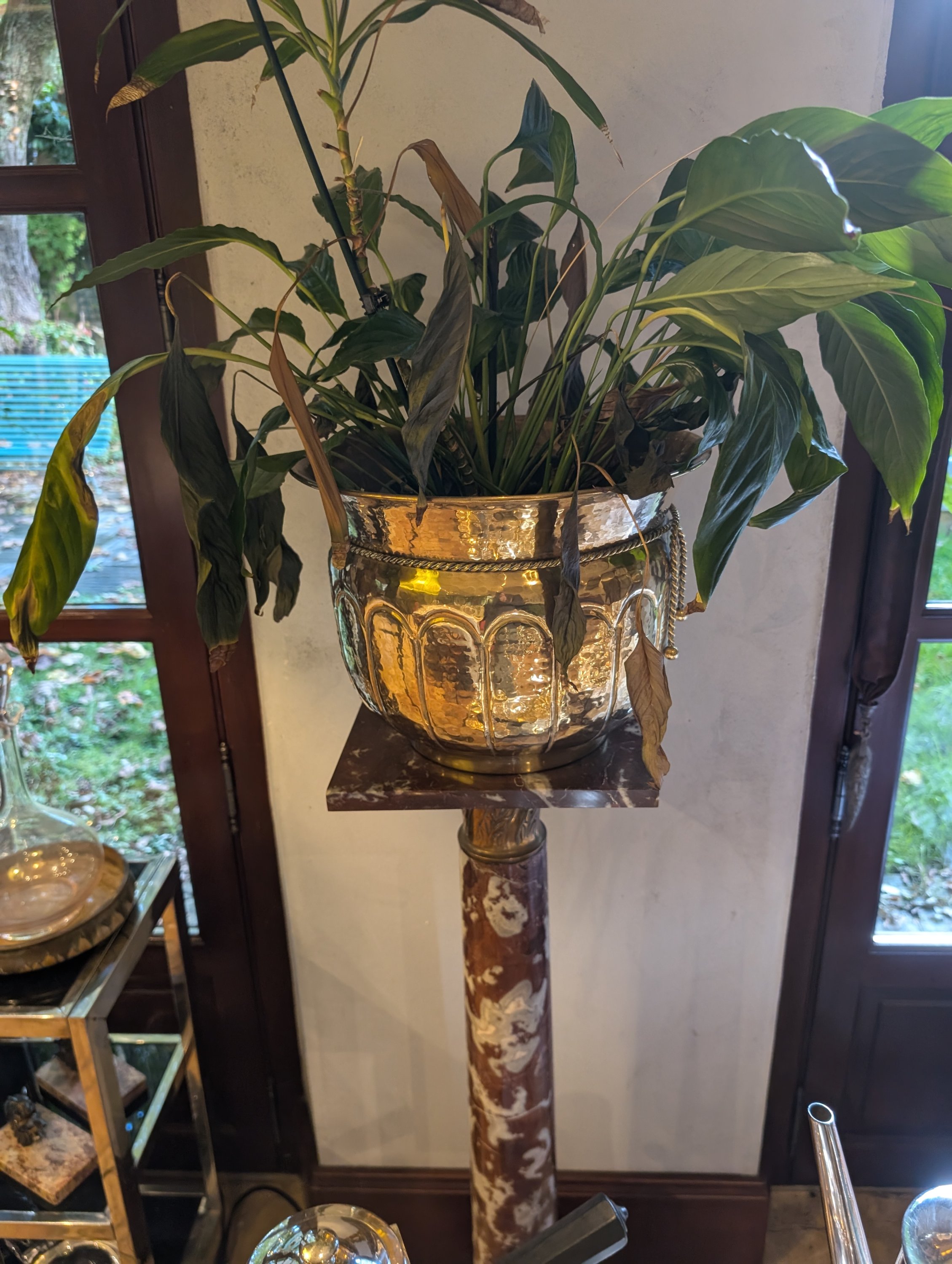 en marbre. Le plateau de forme carrée reposant sur une colonne terminée par une base. Chapiteau et bague en métal doré.