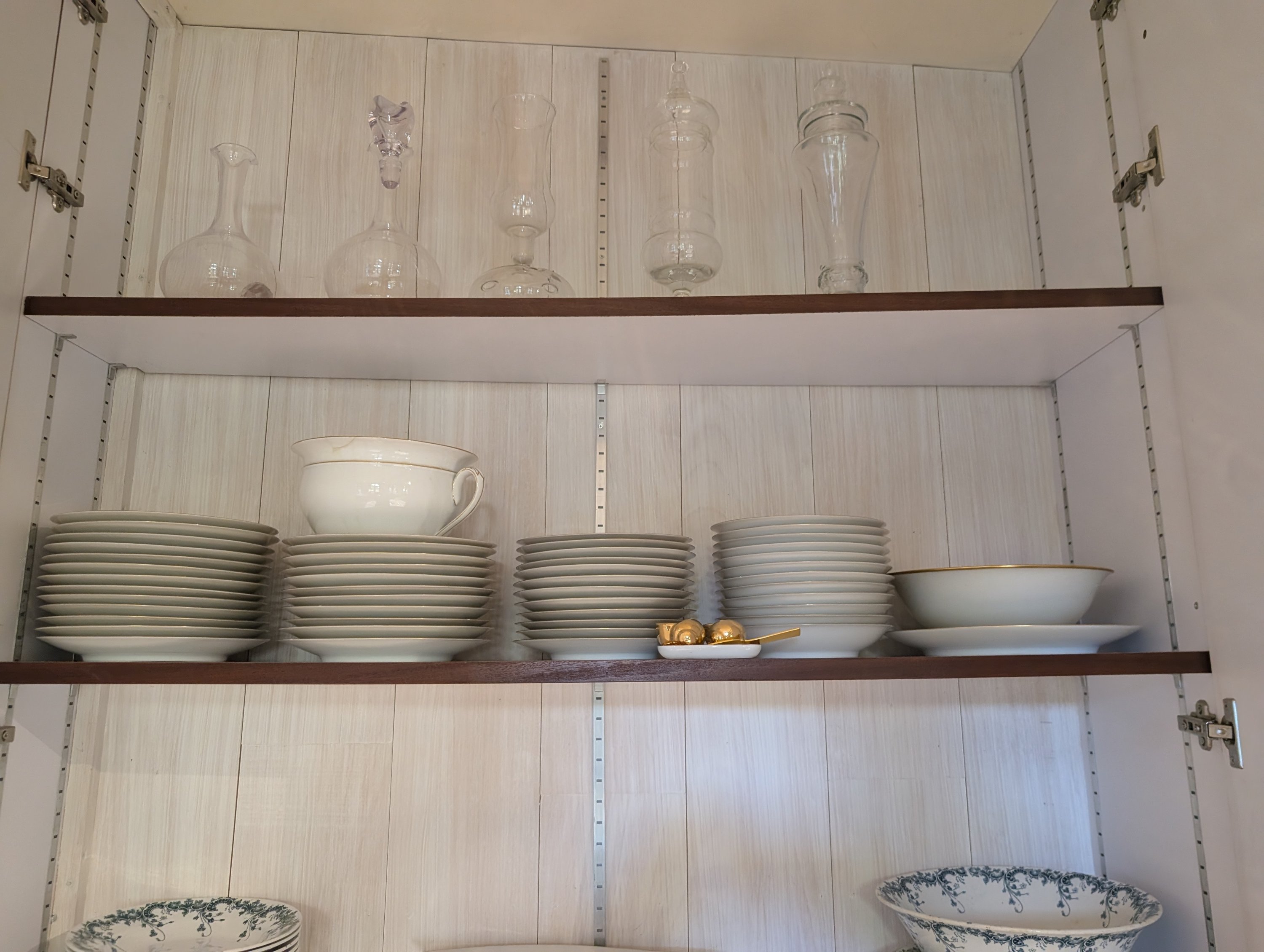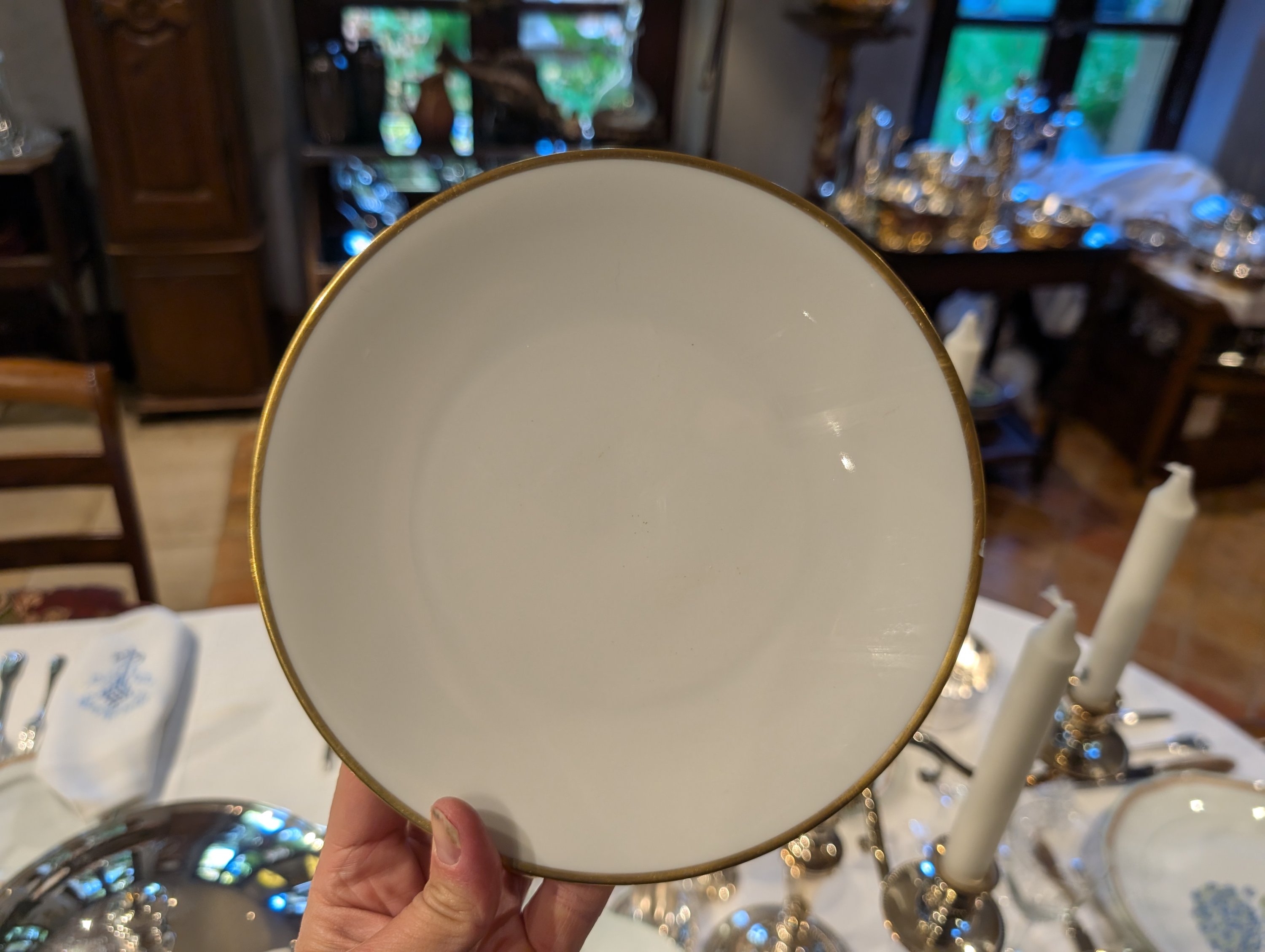 en porcelaine blanche et filet doré comprenant notamment des assiettes plates et assiettes à dessert.