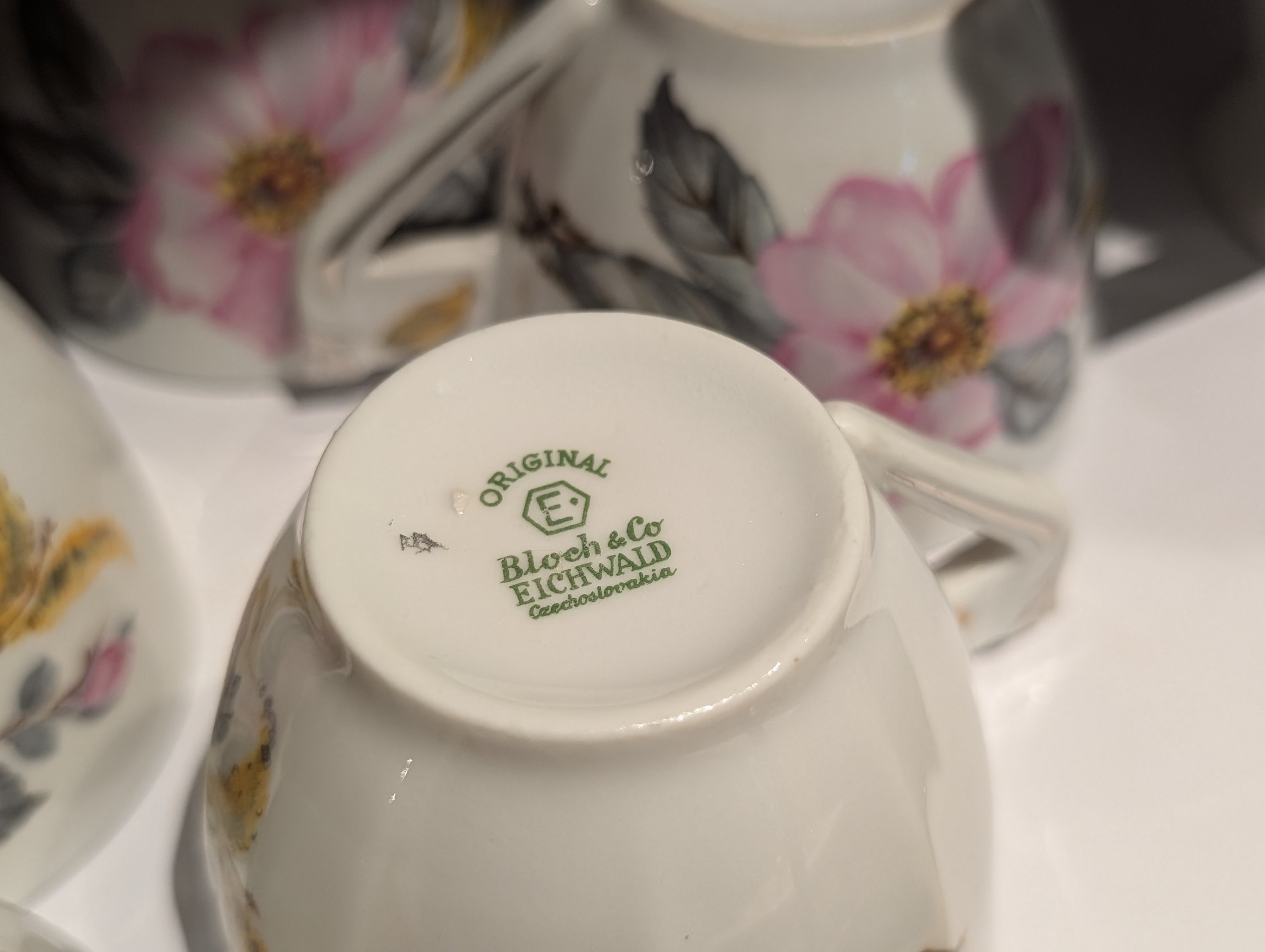 comprenant tasses, soucoupes, théière, cafetière et pot à sucre.