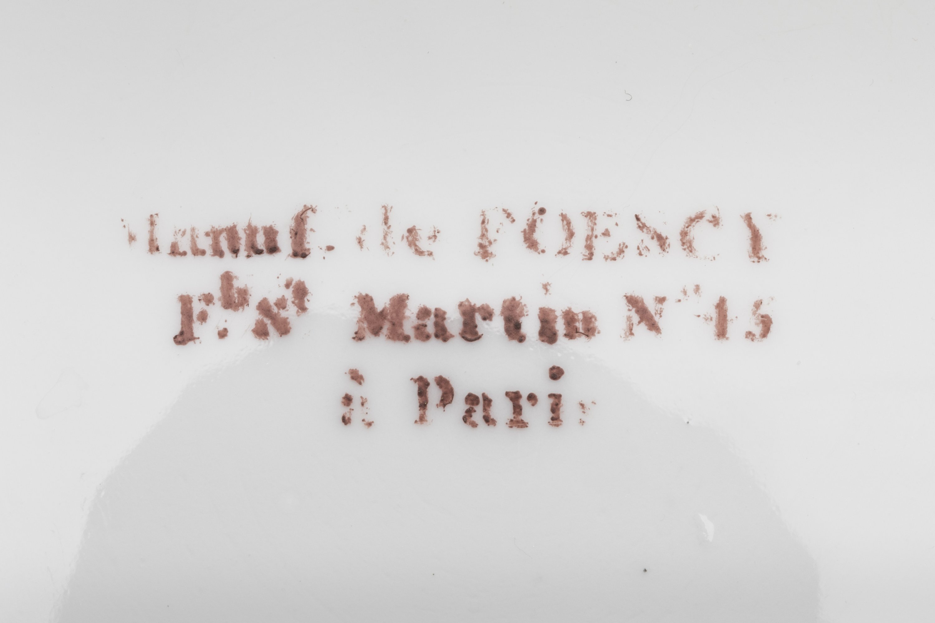 Deux autres assiettes à monter conservées au musée de Sèvres sont marquées, l’une 5 mai 14 n° 2 et l’autre 35- 36 et accompagnées de la marque à la vignette de la manufacture de Foëscy Fb saint Martin n° 45 à Paris, apposée postérieurement.