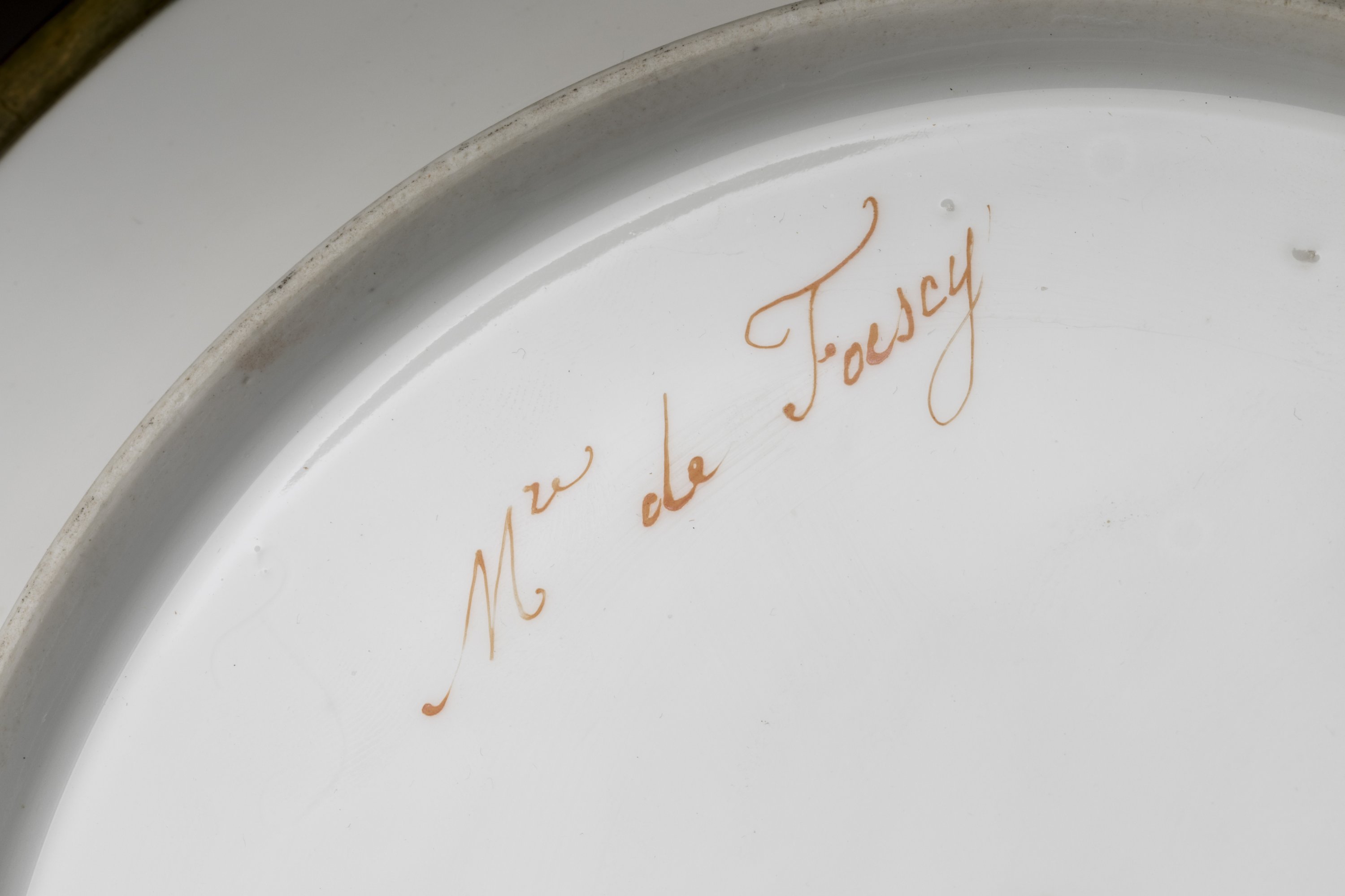 Le service particulier de l’Empereur est commencé en 1807 et livré le 27 avril 1810 au Palais des Tuileries, avant le mariage impérial le 2 avril 1810. Il comportait 72 assiettes à dessert peintes, 24 assiettes à potage et 24 assiettes à dessert nommées assiettes à monter à bordure seulement. Ces assiettes en porcelaine de Sèvres portant la marque de Foescy font partie des quelques pièces de complément aujourd’hui connues. Certaines font sans doute partie des quatre assiettes livrées le 30 janvier 1812 à Son Excellence le Grand Maréchal du Palais, (arch. Sèvres, Cité de la céramique, Vy21, f° 3 v).