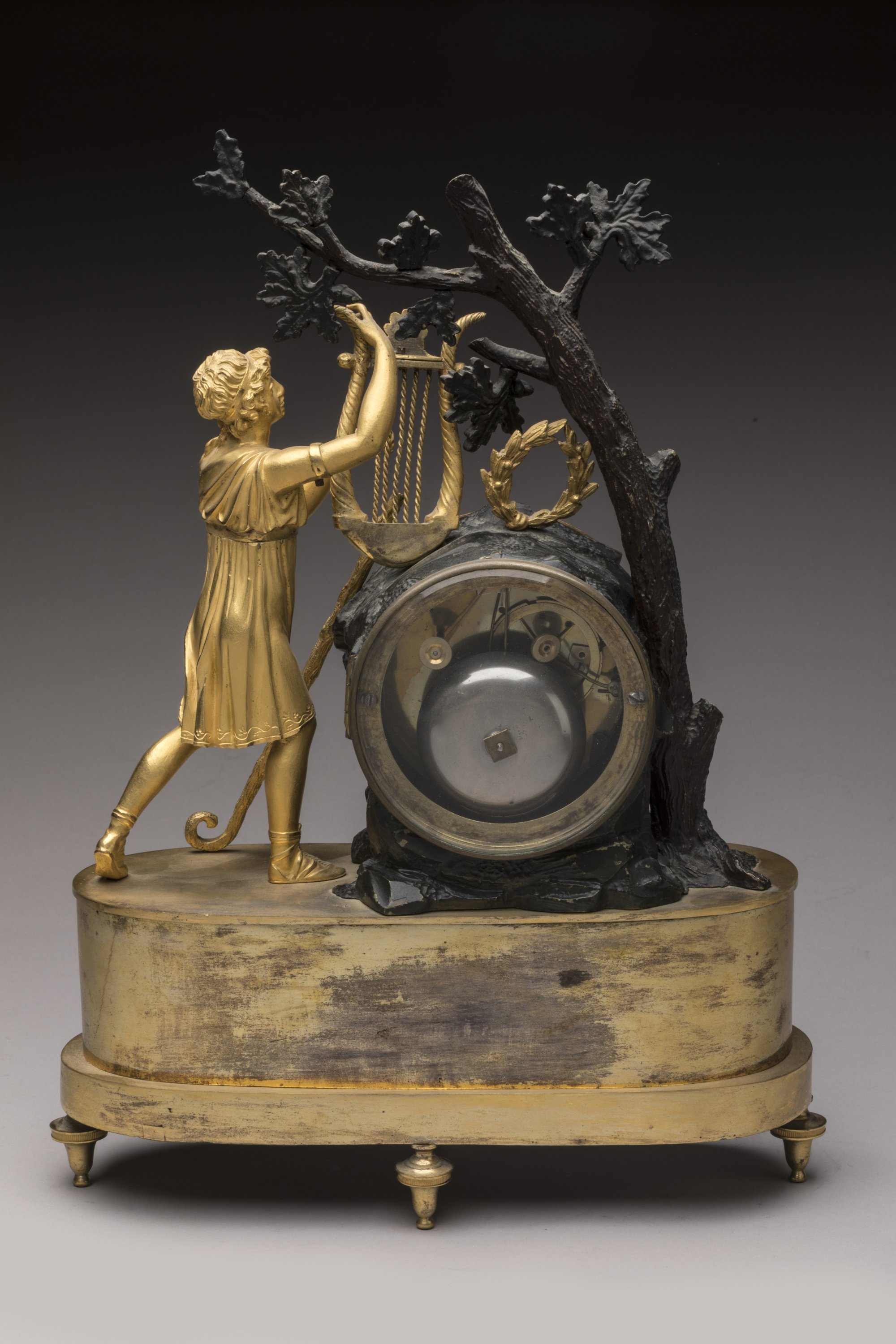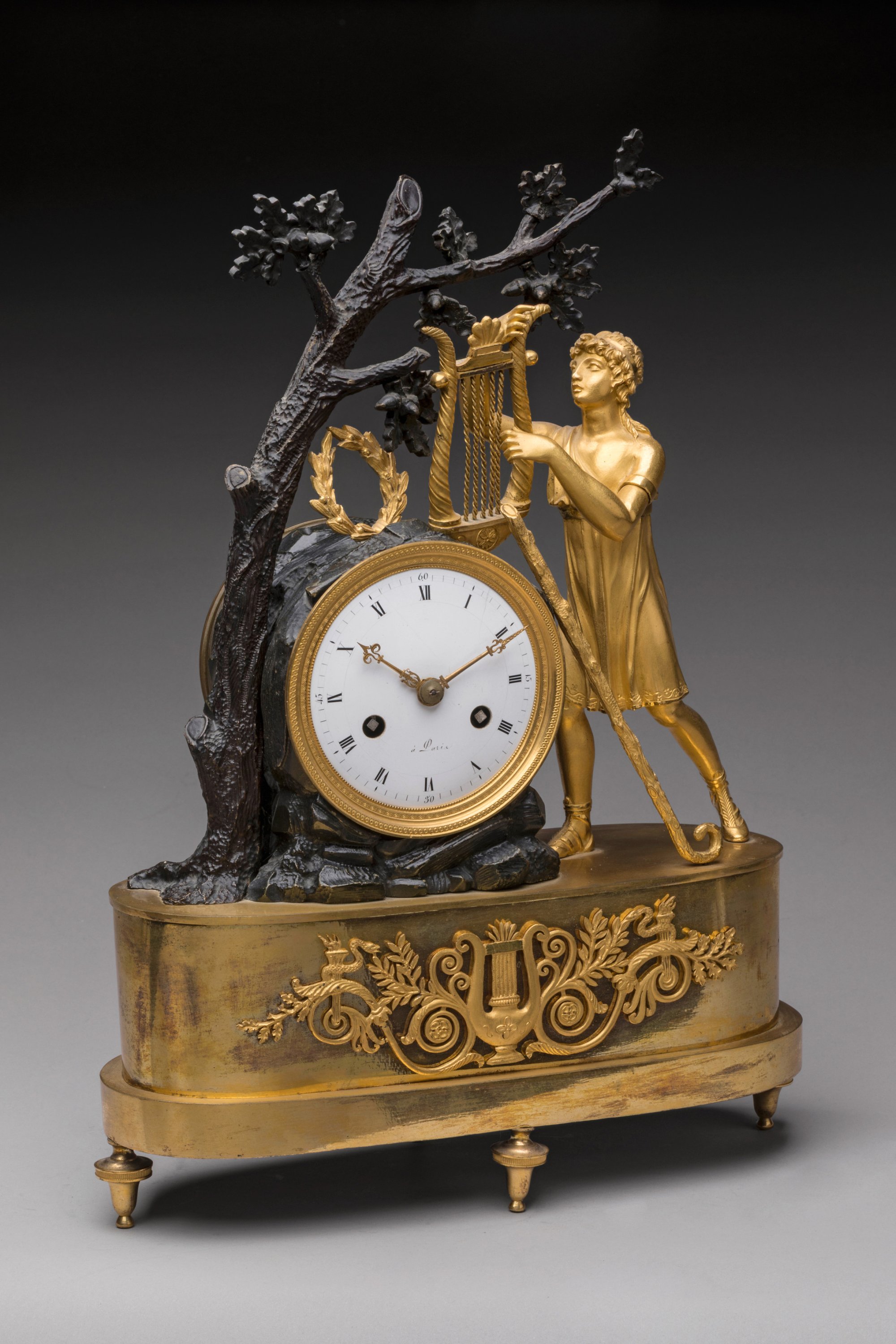 An ormolu clock featuring Eurydice holding a lyre. Early 19th century.