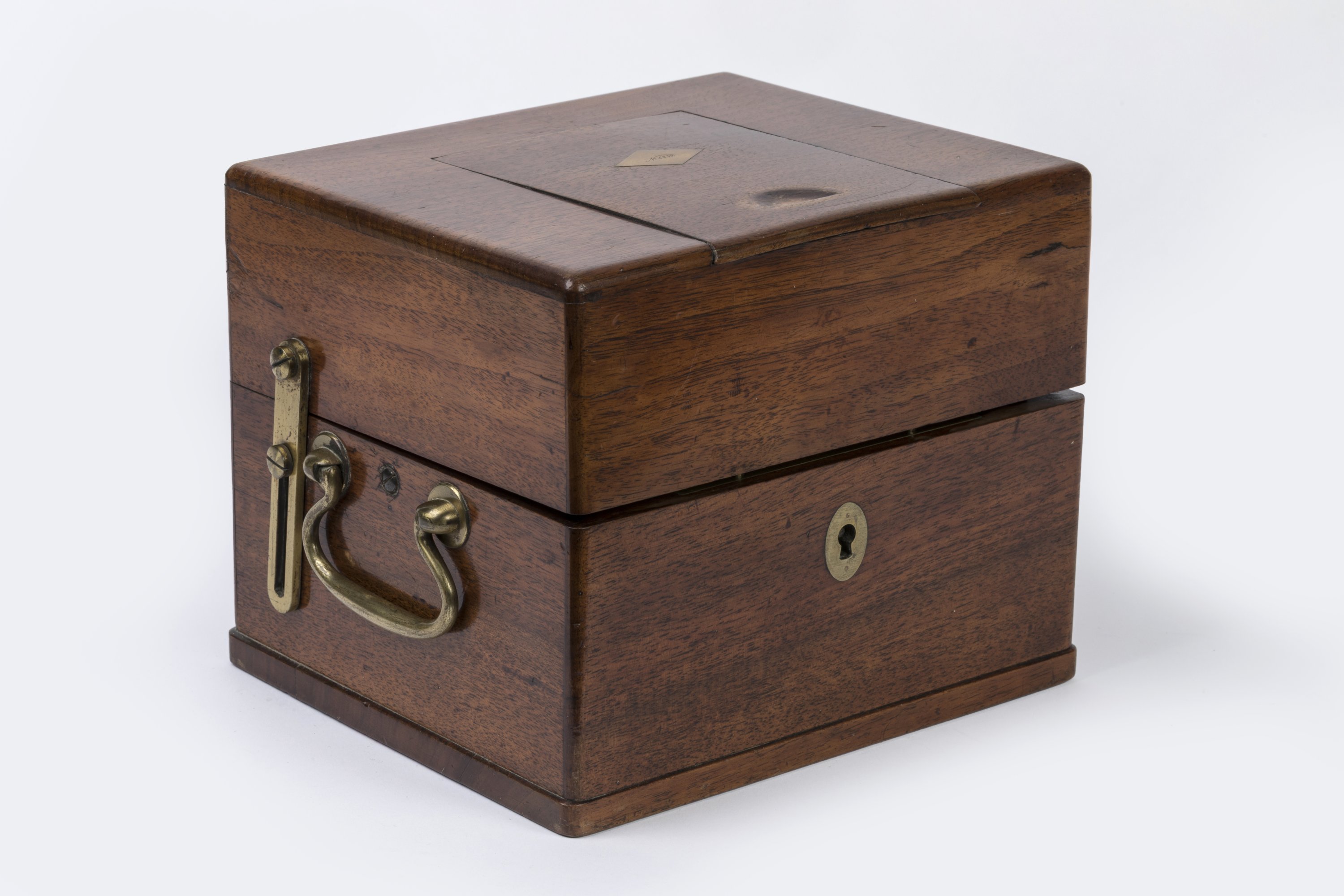 Breguet. A 1829-1830 single-barrel marine chronometer, walnut outer case with brass hinges and handles, brass clock case and Cardon suspension, silver-plated dial with subdial for hours/minutes above subdial for seconds, spring detent platform escapement. Signed and numbered.