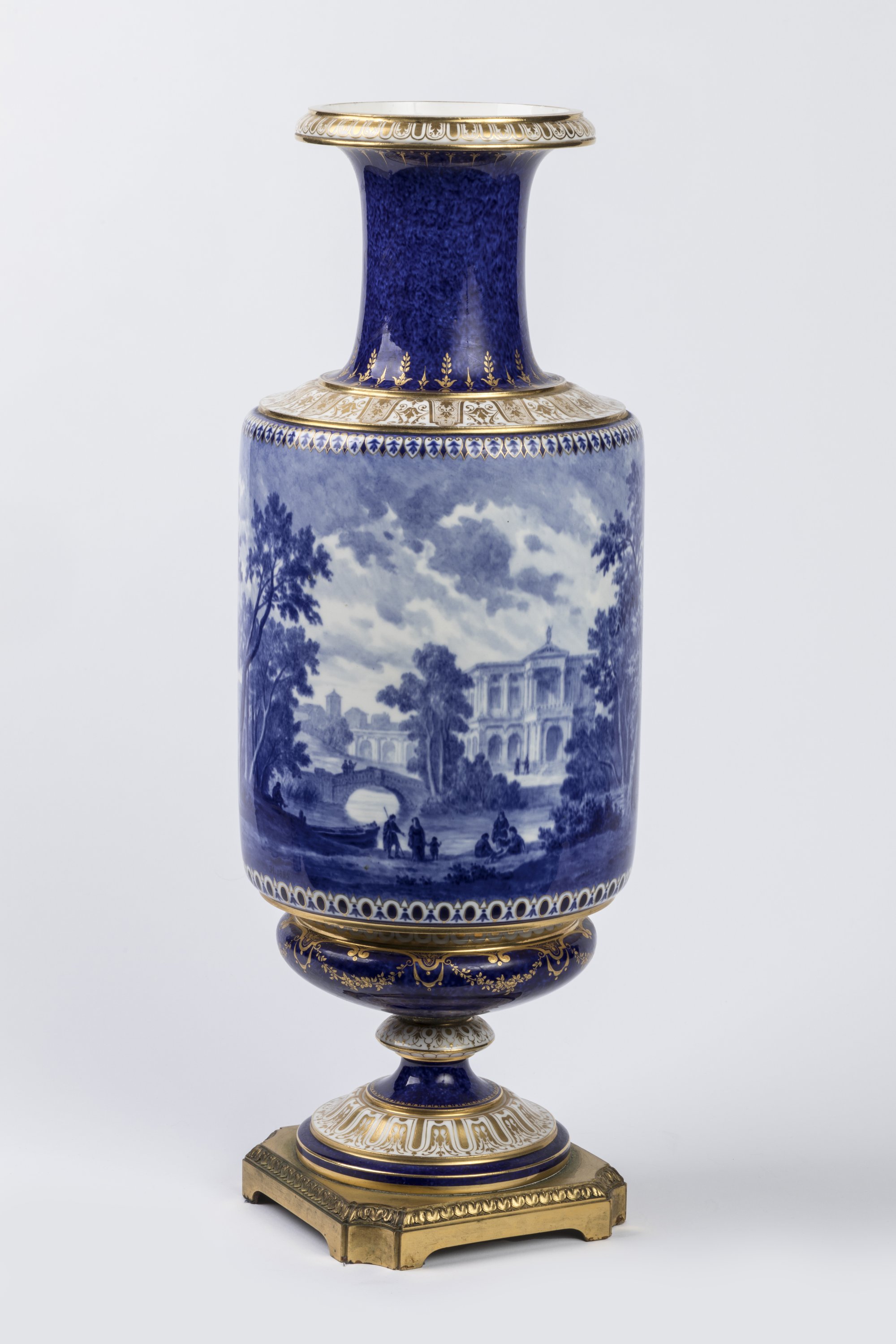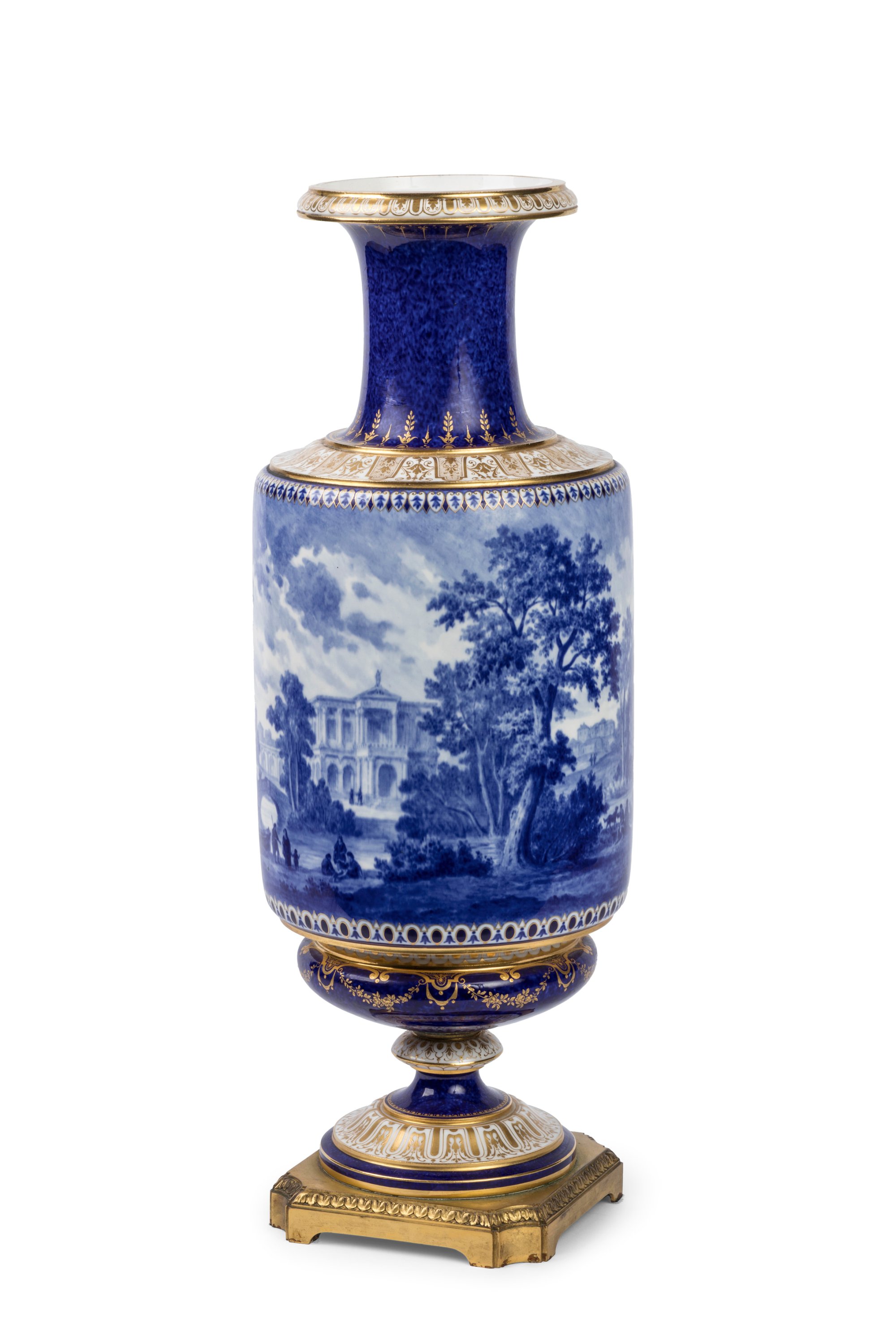 Eugène Hallion. An 1885 large ormolu-mounted blue baluster vase decorated with an Italian landscape. Monogrammed and dated.
