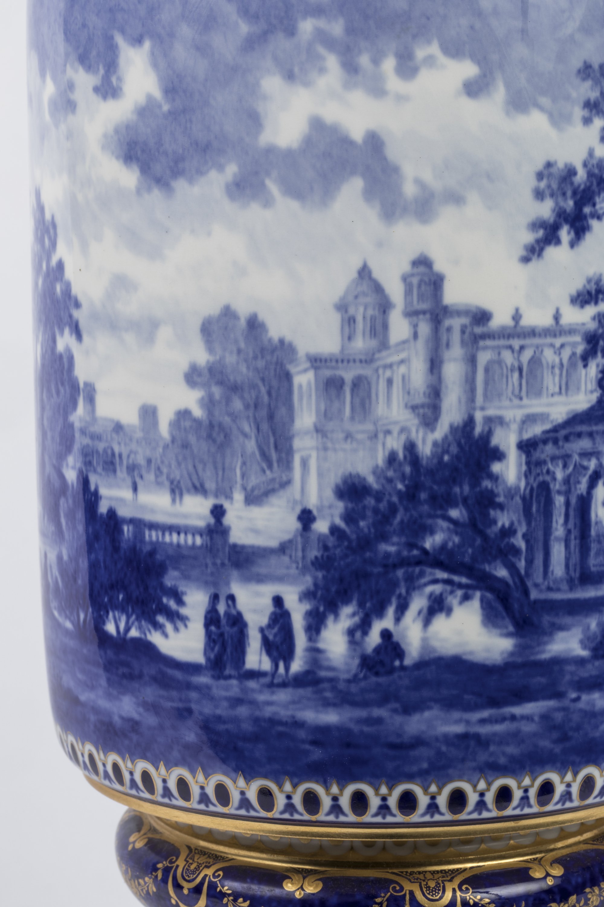 Décor en bleu d’un paysage avec palais italien et jardins animés, le col évasé, le pied circulaire terminé par une monture en bronze.