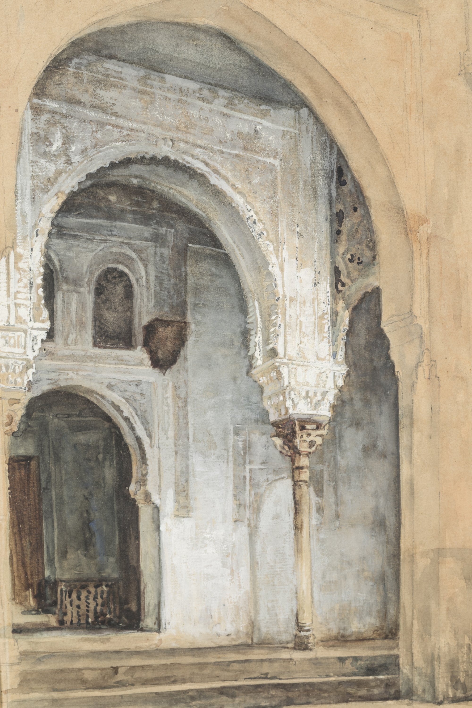 George Clairin. A drawing featuring one of the gates of the Alhambra Palace. Gouache, watercolor and black pencil on paper in a gilted stucco frame. Signed.