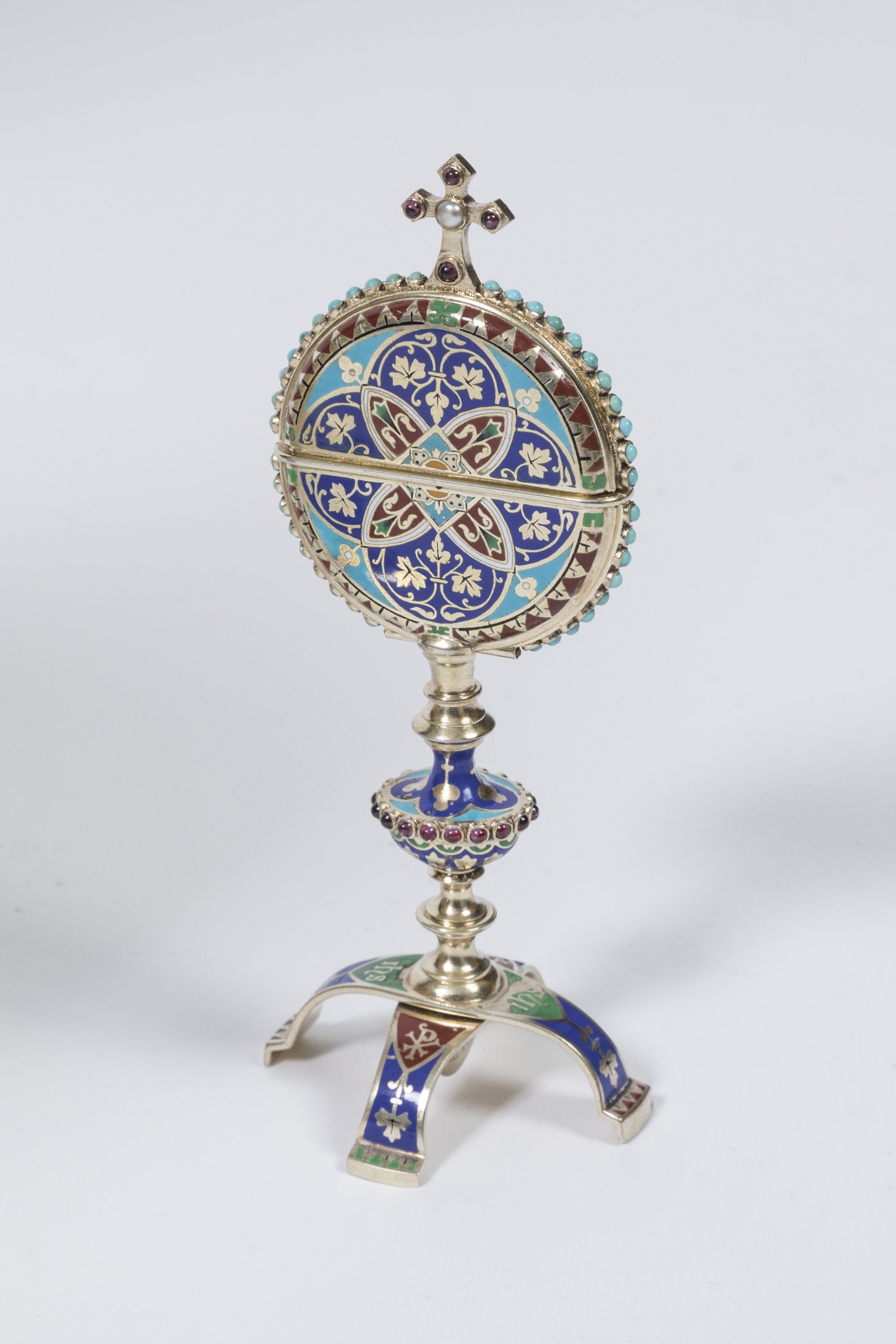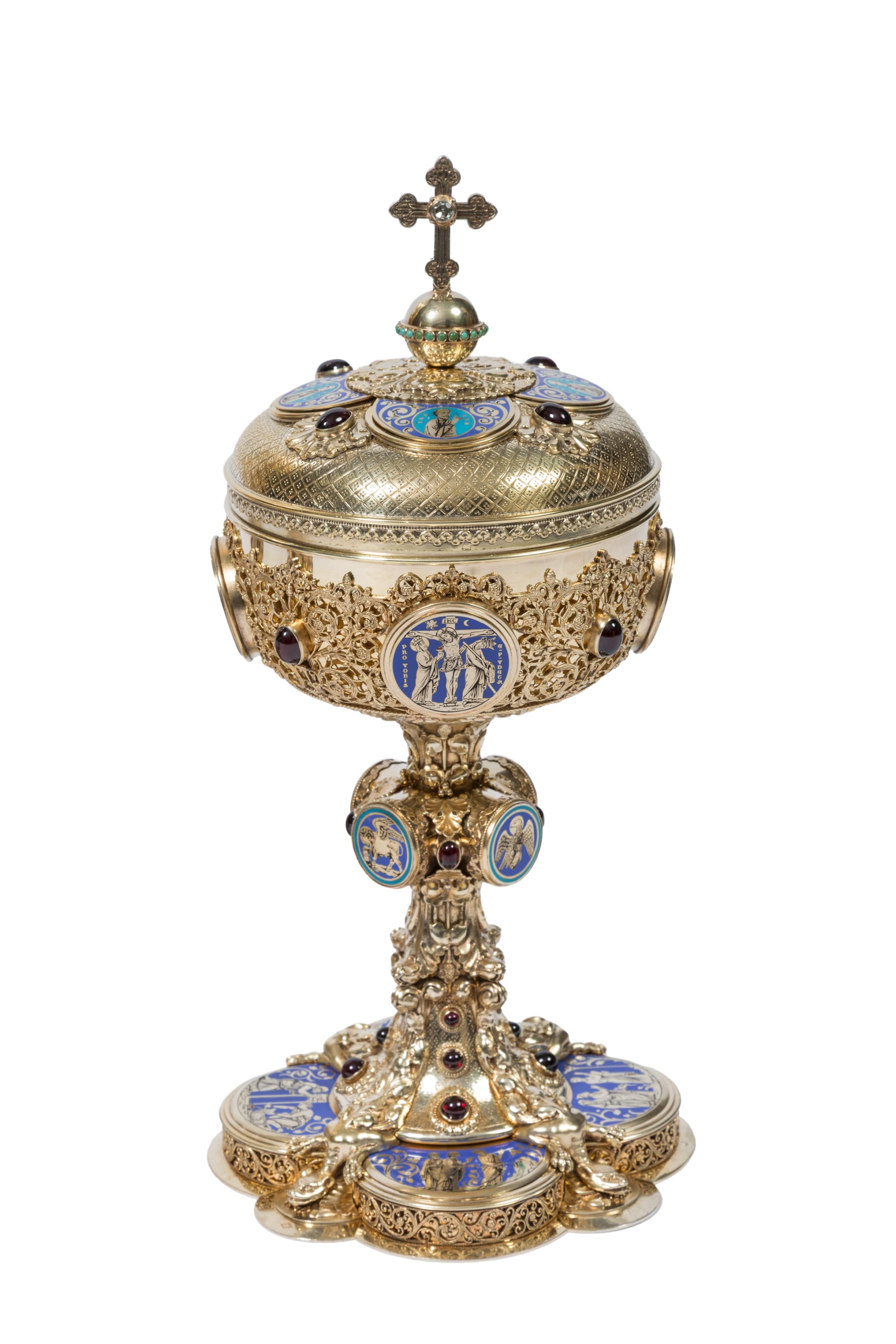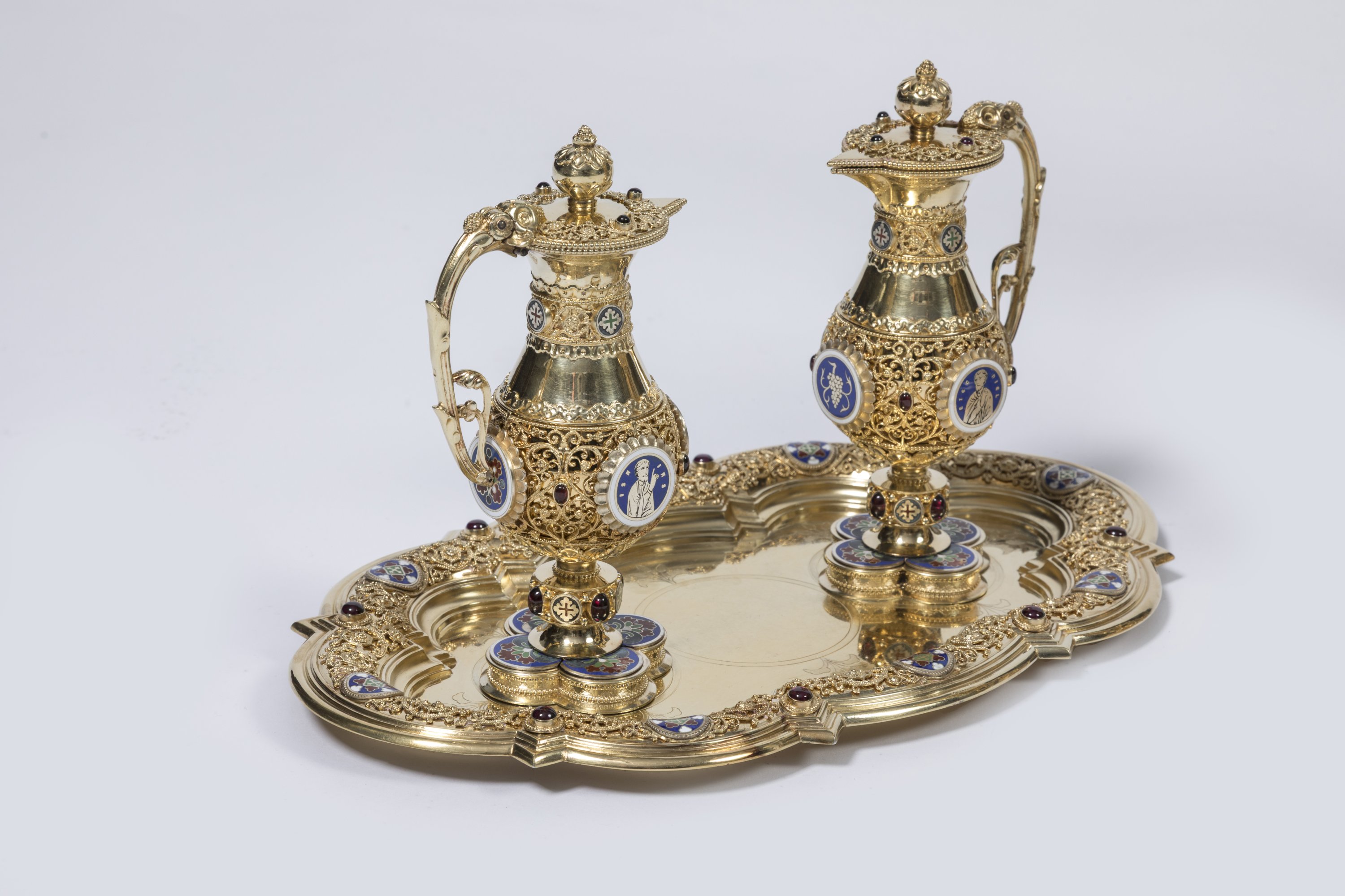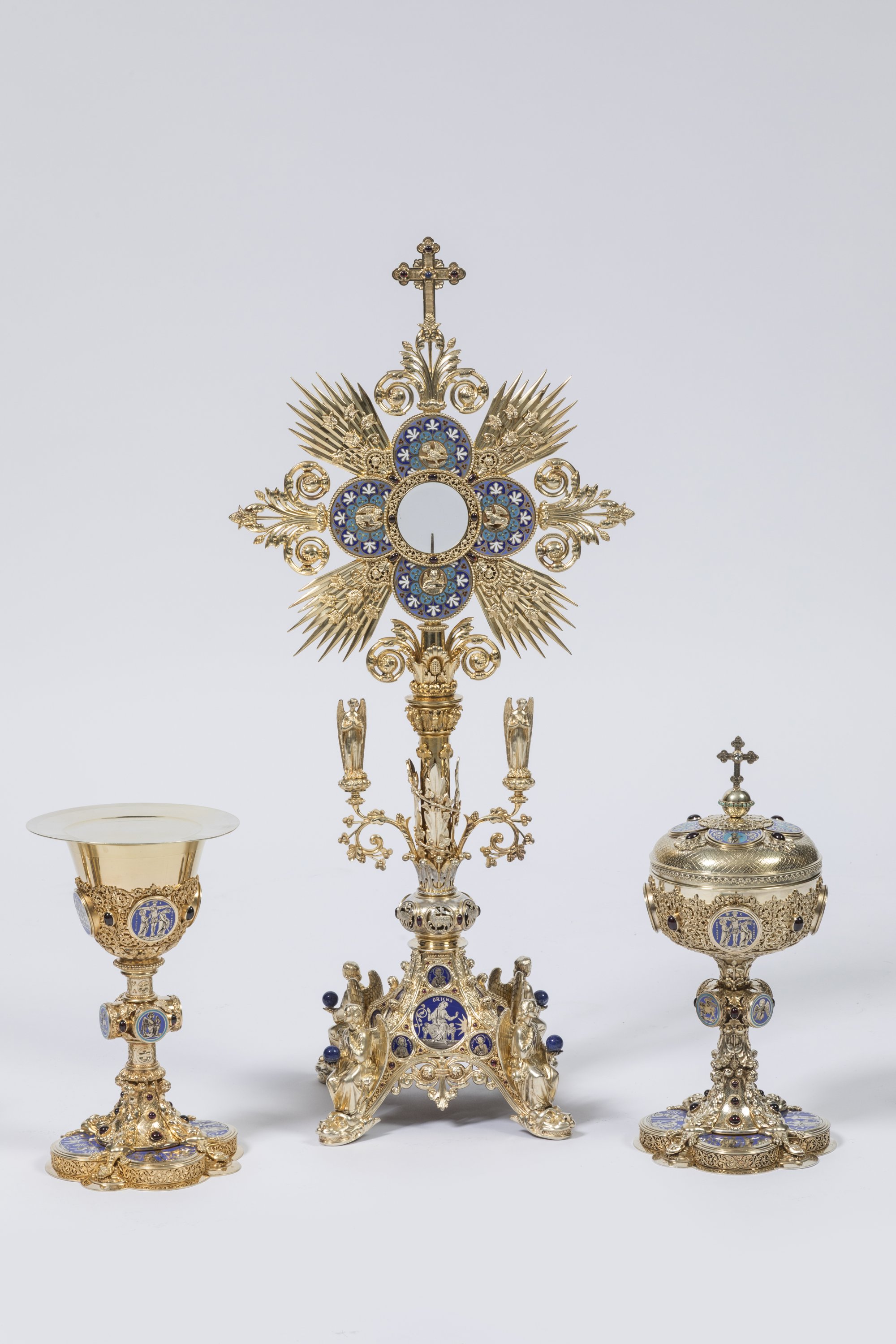 Placide Poussielgue-Rusand. A vermeil, enamel and imitation gemstones altar set comprising a monstrance, chalice, paten, ciborium, custodial, cruets and their tray. Designed by Reverend Father Arthur Martin, this set is identical to the one used on the occasion of the consecration of Monseigneur de Dreux-Brézé in the Notre Dame Cathedral on April 14, 1850.