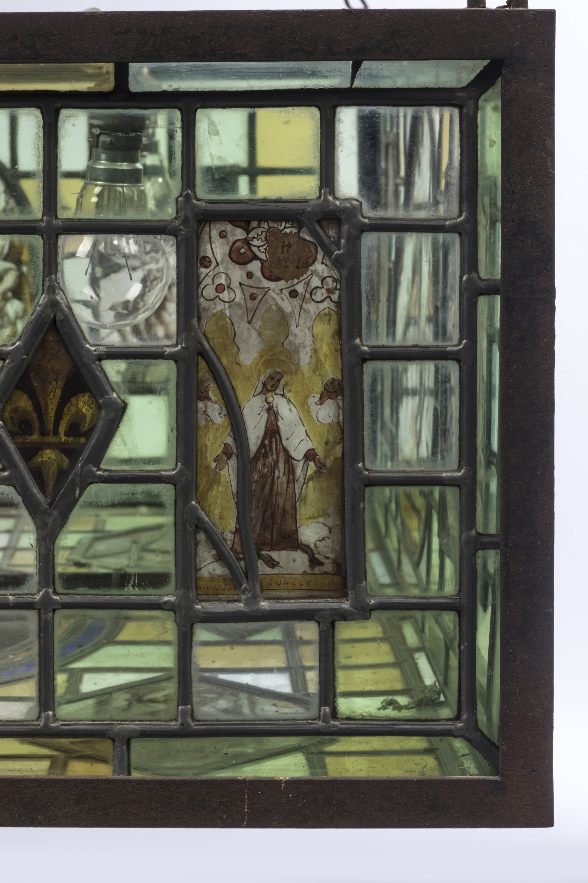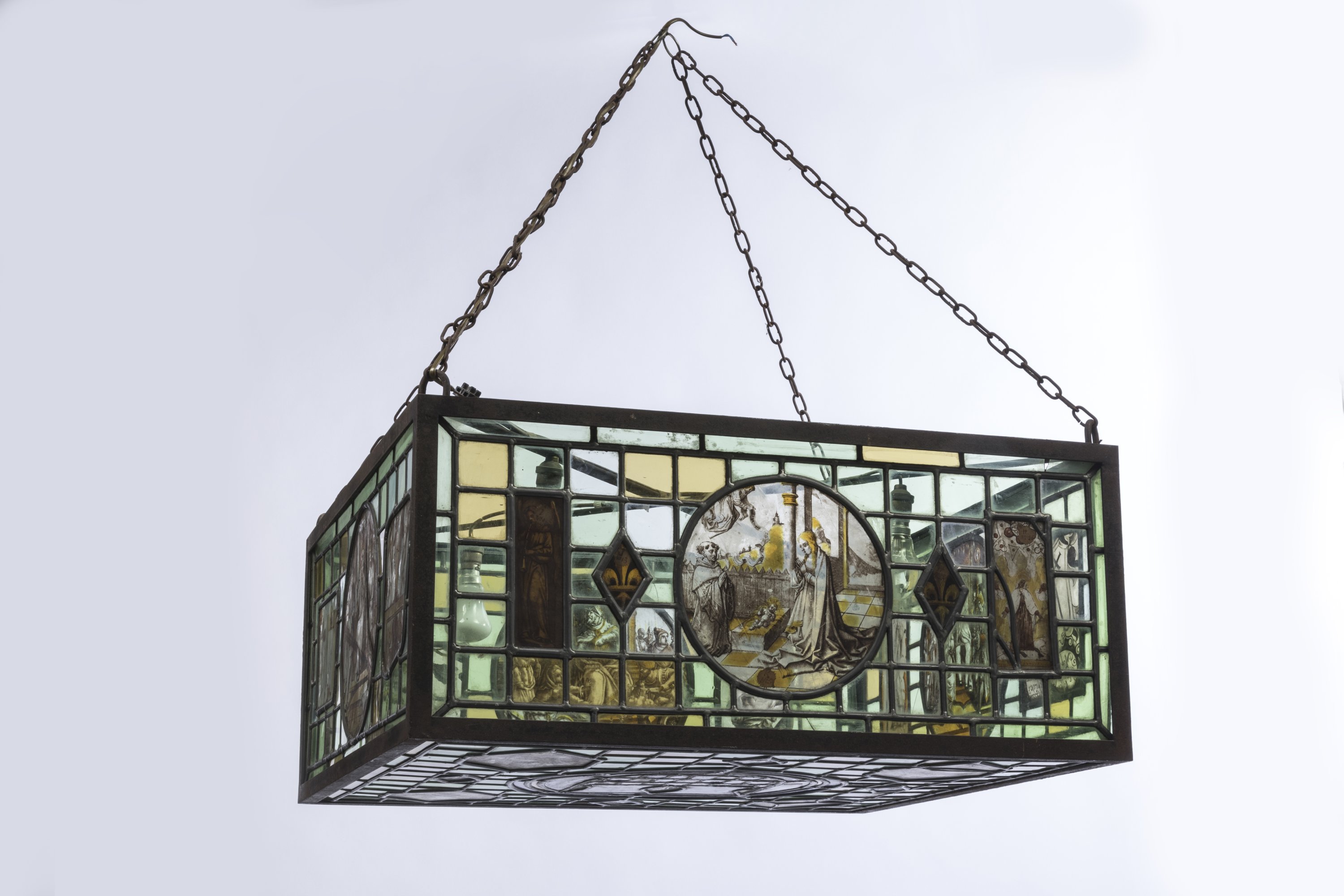 A 1924 lead and stained-glass window chandelier by the workshop of Louis Barillet depicting the Judgement of Solomon. Includes four 16th century stained glass medallions.