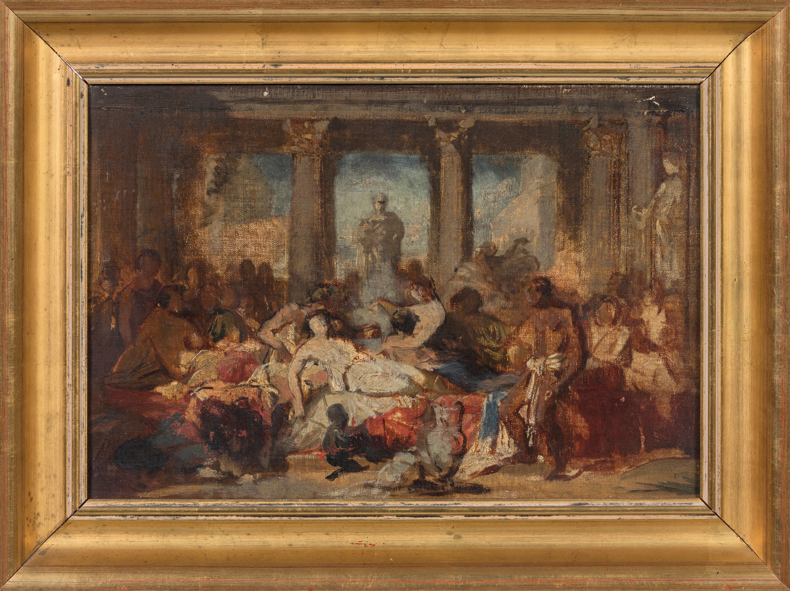 A painting depicting the Romans in their Decadence by a follower of Thomas Couture. Oil on original canvas. In a giltwood frame. French School, ca 1850.
