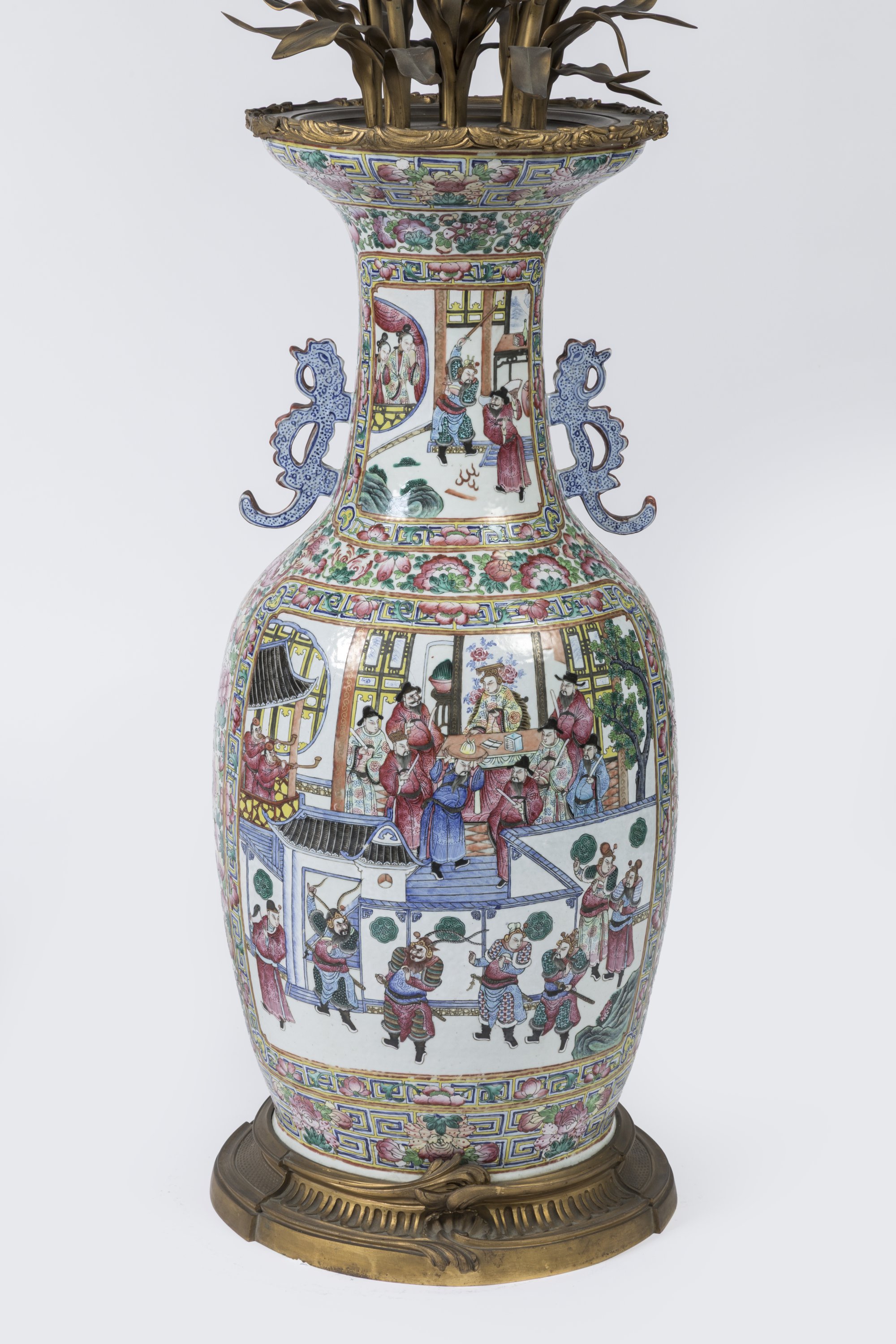 De forme balustre à décor émaillé de scènes de palais. La monture en bronze doré sous la base et à la lèvre retient en partie supérieure huit branches fleuries en bronze doré terminées par des fleurs de lys formant flambeaux.