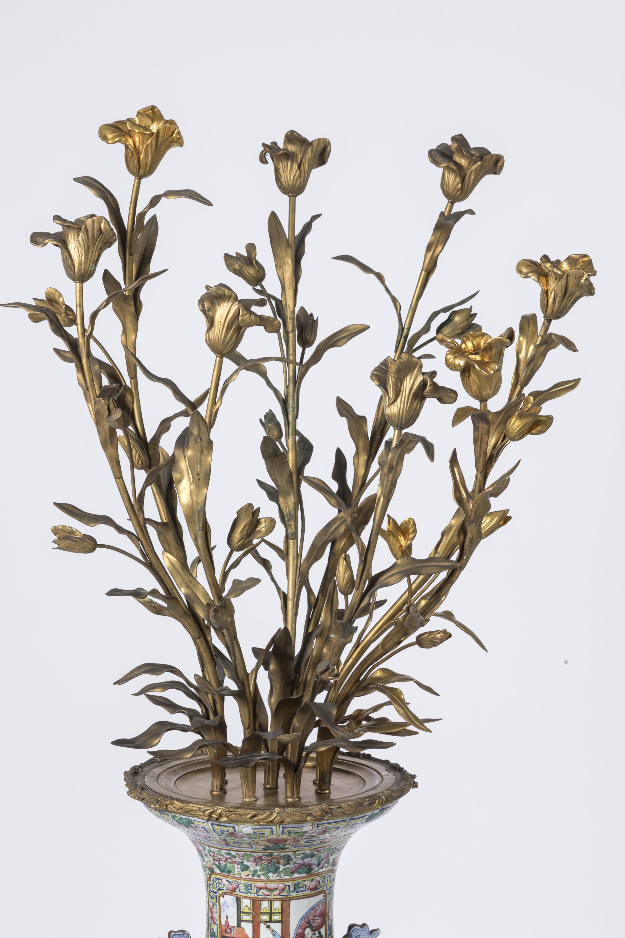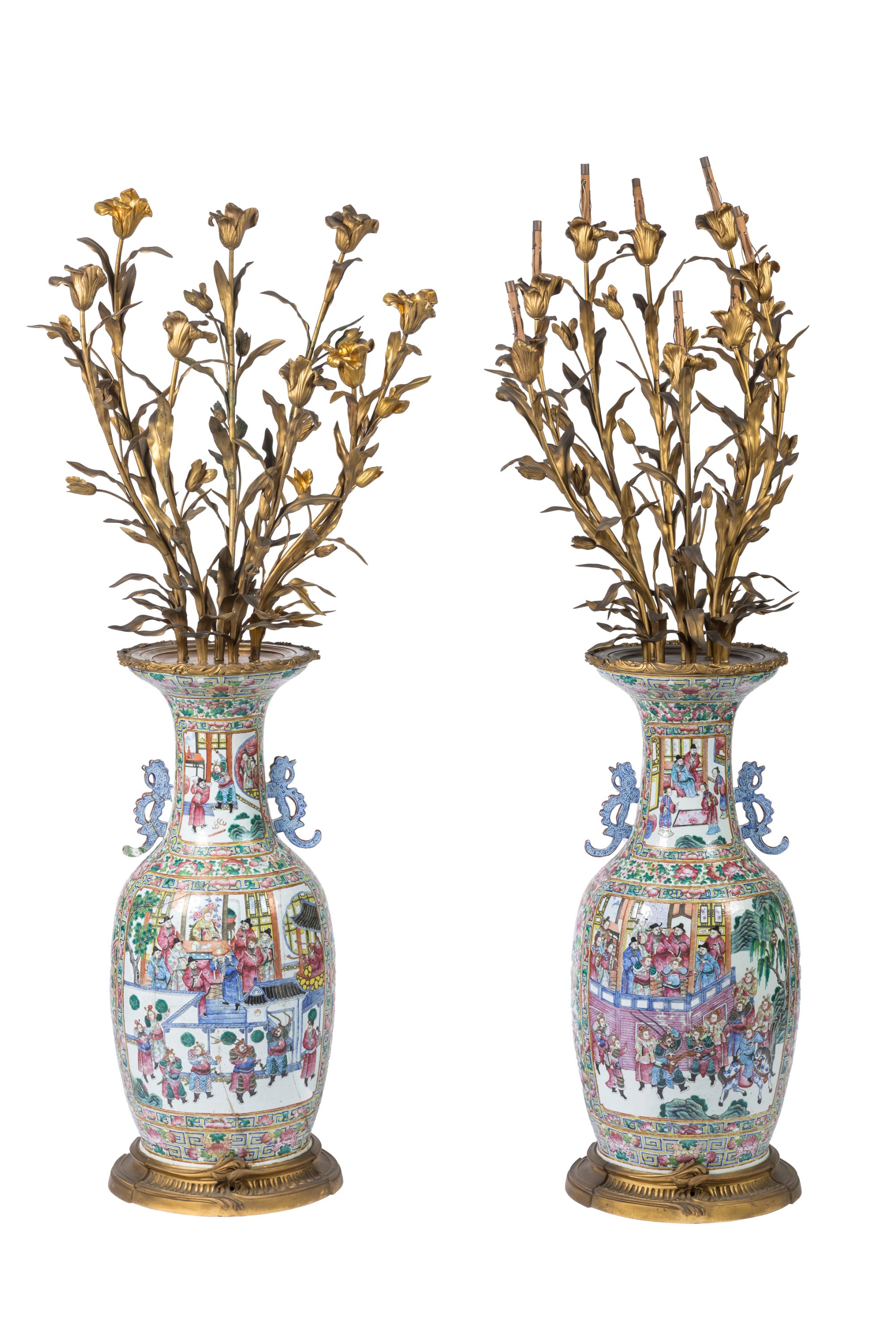 A spectacular pair of ormolu-mounted Canton porcelain candelabra vases.
